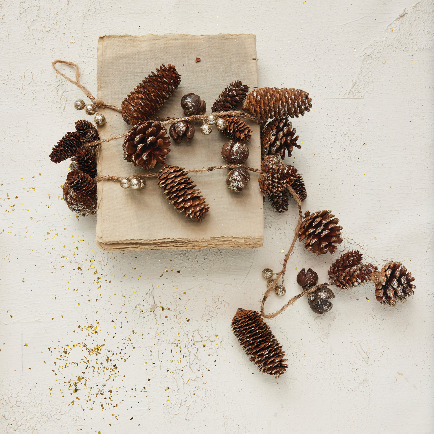 Pinecone Garland with Seed Pods & Glitter, Natural & Gold Color
