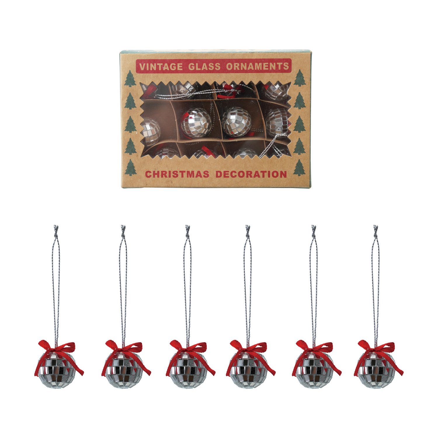 Catalog Name: 2"H Foam & Glass Mini Mirror Ball Ornaments w/ Bow, Silver Finish & Red, Boxed Set of 12