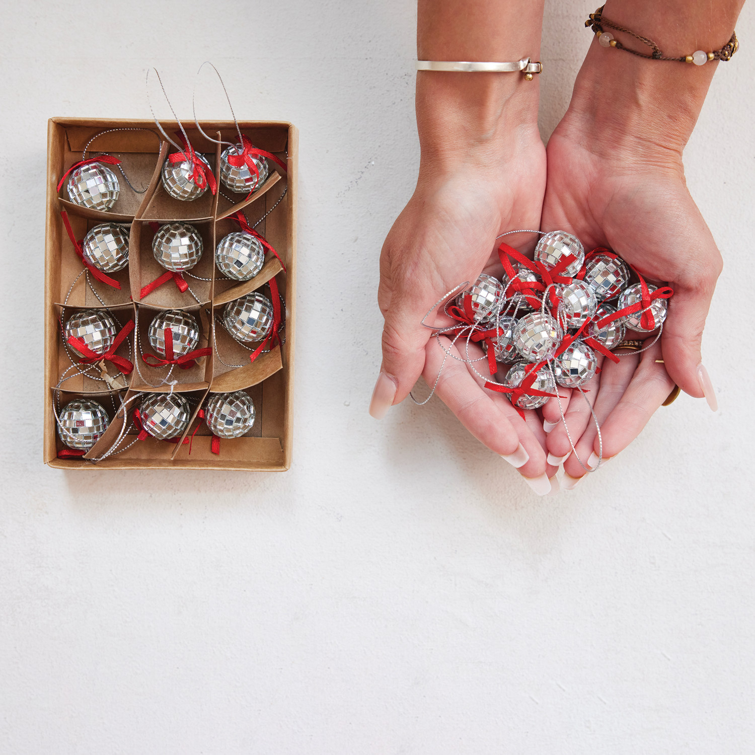 Foam & Glass Mini Mirror Ball Ornaments with Bow, Boxed Set of 12
