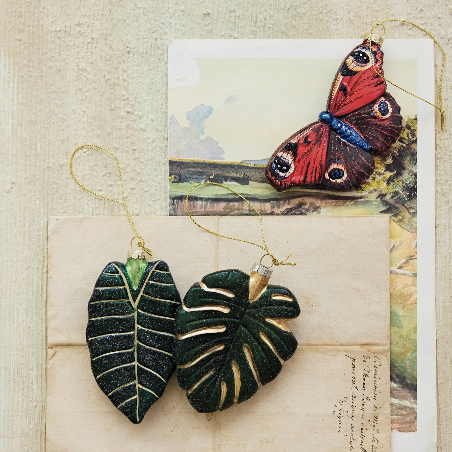 Catalog Name: 4-3/4"H Hand-Painted Mercury Glass Tropical Leaf Shaped Ornament w/ Glitter, Green & Gold Finish, 2 Styles