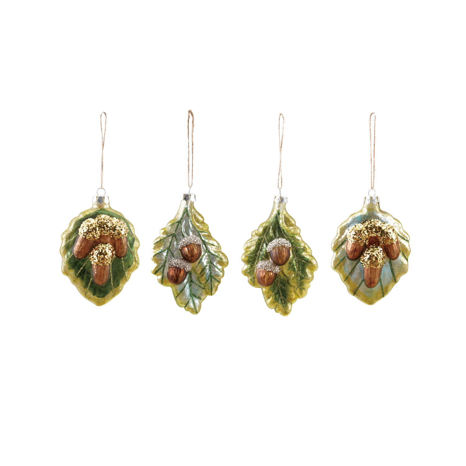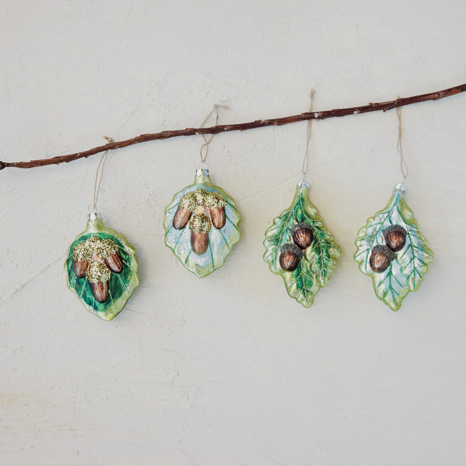 Hand-Painted Mercury Glass Leaf Ornament with Acorns & Glitter, 2 Colors, 2 Styles