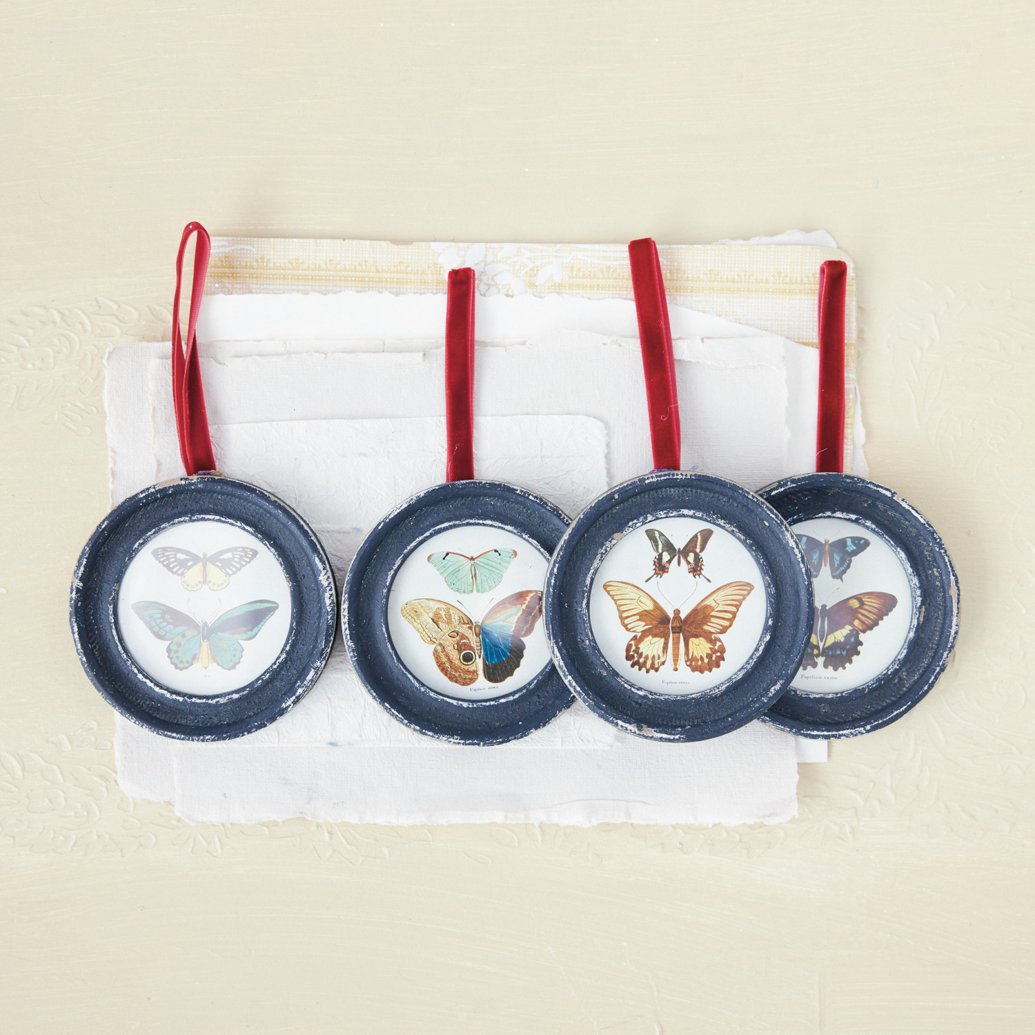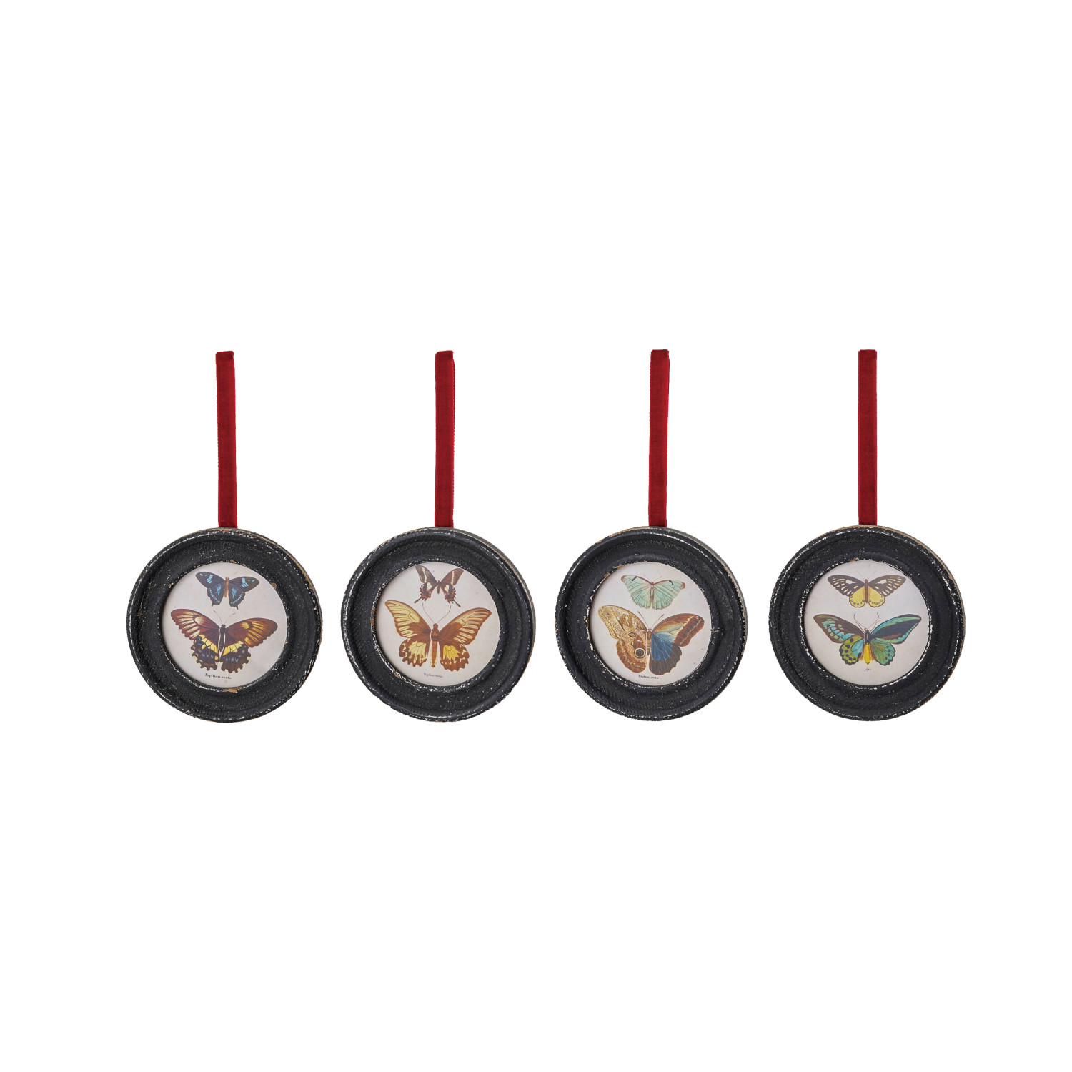Catalog Name: 4" Round MDF Framed Glass Ornament w/ Butterflies & Red Velvet Ribbon Hanger, Multi Color, 4 Styles