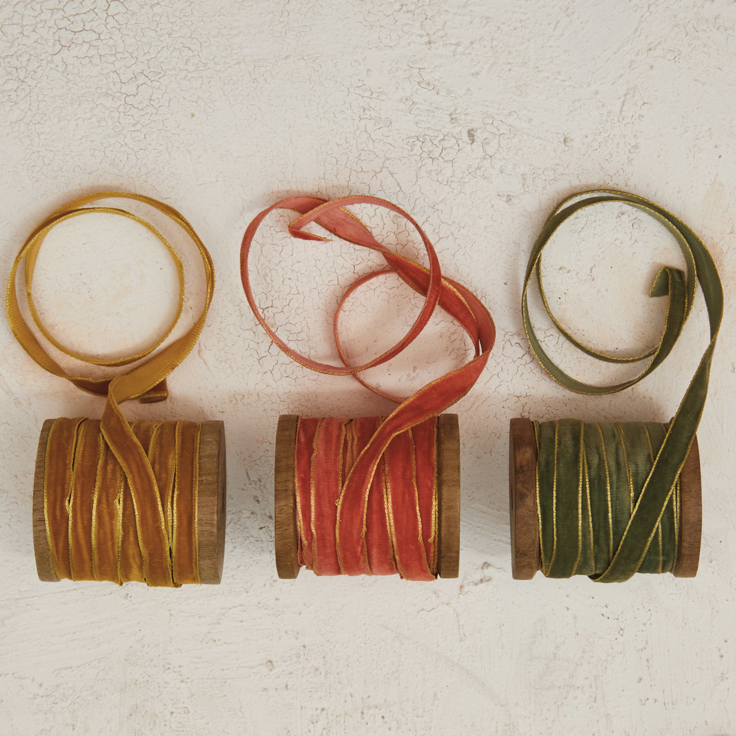 This set of 3 velvet ribbons with metallic edges on a wood spool is a luxurious and elegant addition to the craft projects. Made of viscose and lurex, these ribbons have a velvety and glittery feel and are high-quality and flexible. Each ribbon comes in different colors like green, gold and coral color, adding vibrancy and variety to the collection. The metallic edge adds contrast and sparkle. These ribbons are versatile, suitable for wrapping gifts, making bows, decorating cards, or embellishing home accessories. Measuring 360 inches in length, they are perfect for any occasion or theme as a decoration for the home.