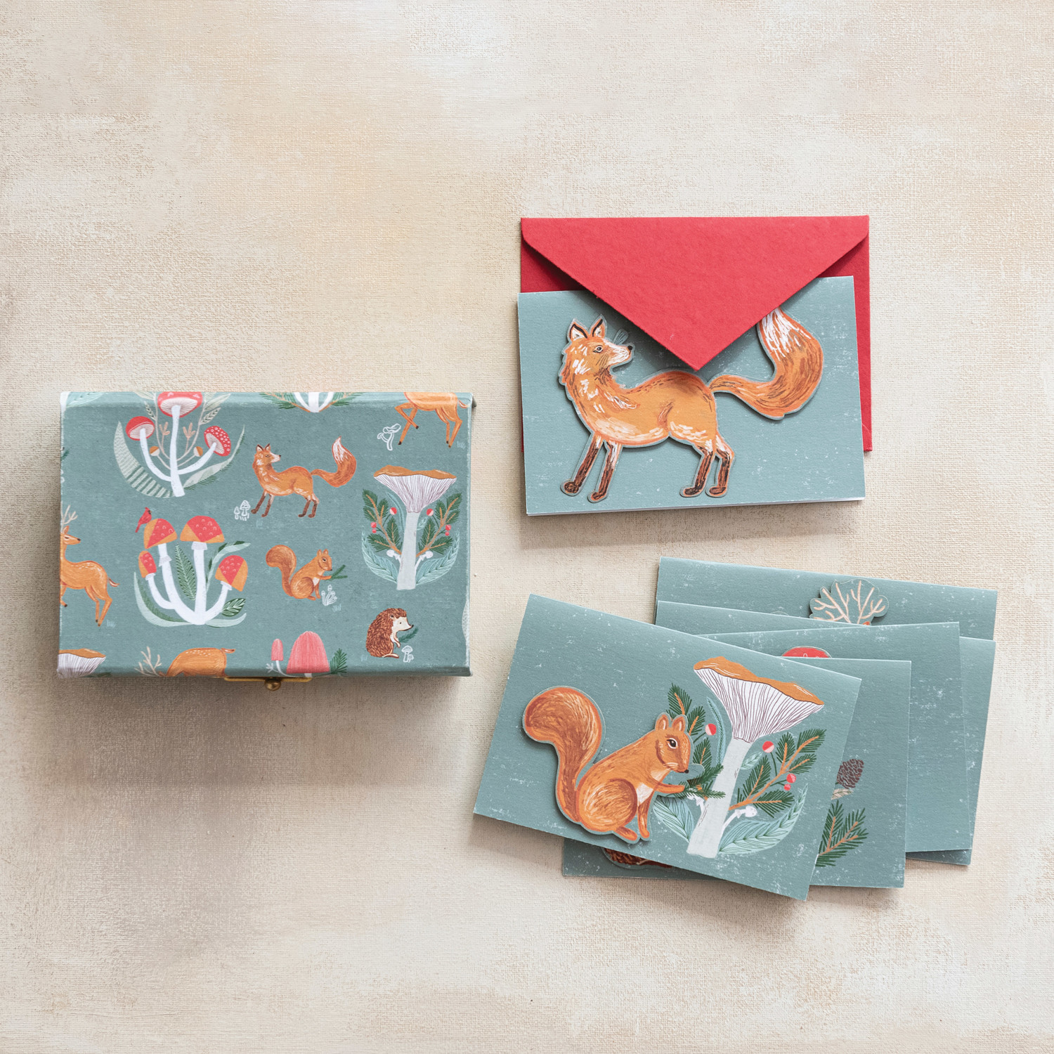 Catalog Name: 7"L x 4-3/4"W Printed Paper Diecut Christmas Cards w/ Woodland Flora/Fauna, Applique & Red Envelopes, Multi Color, 6 Styles, Boxed Set of 6 (Blank Inside) ©