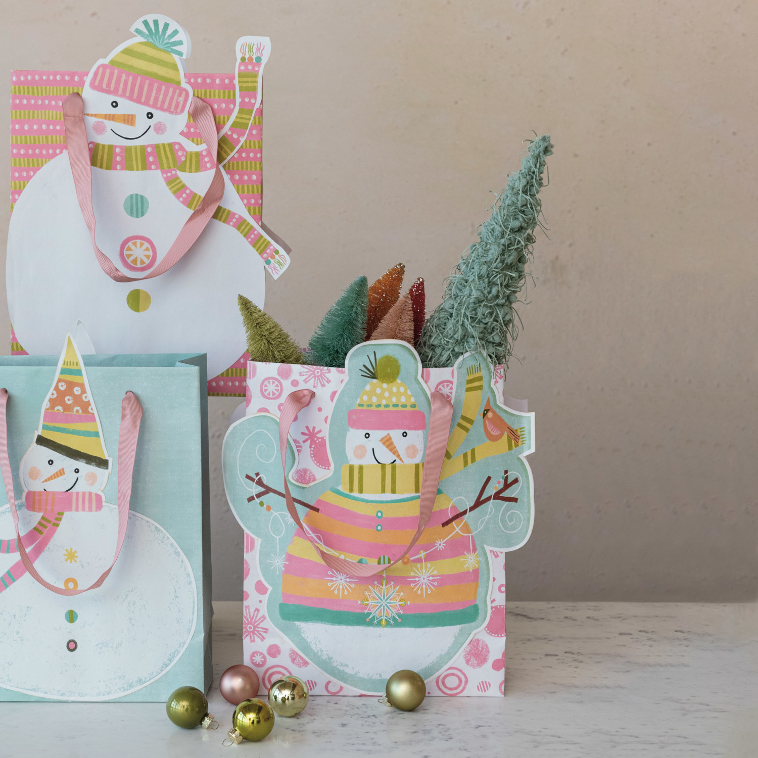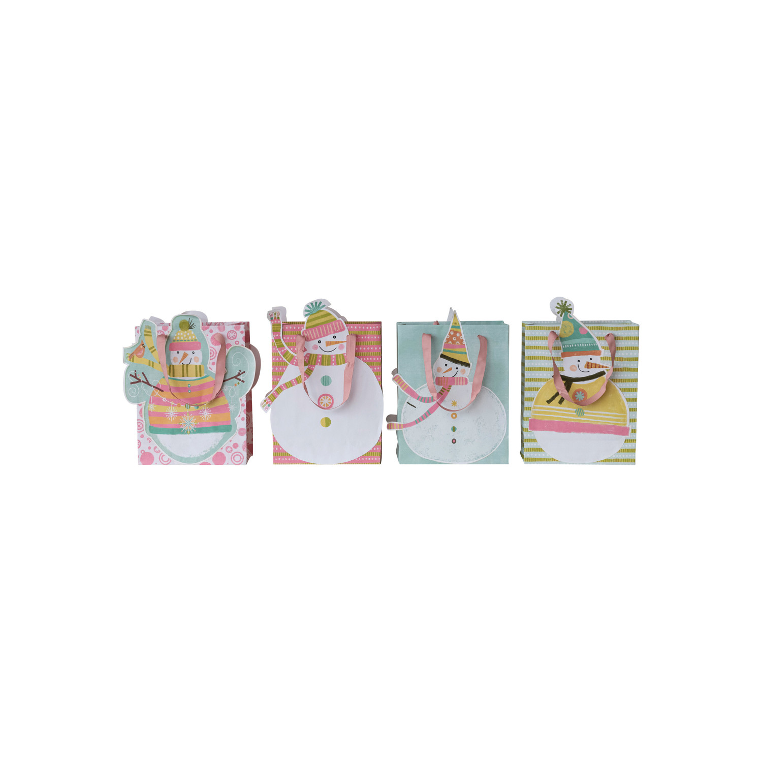 Catalog Name: 12-1/2"H - 13-1/2"H Printed Recycled Paper Snowman Shaped Gift Bag, Multi Color, 4 Styles ©