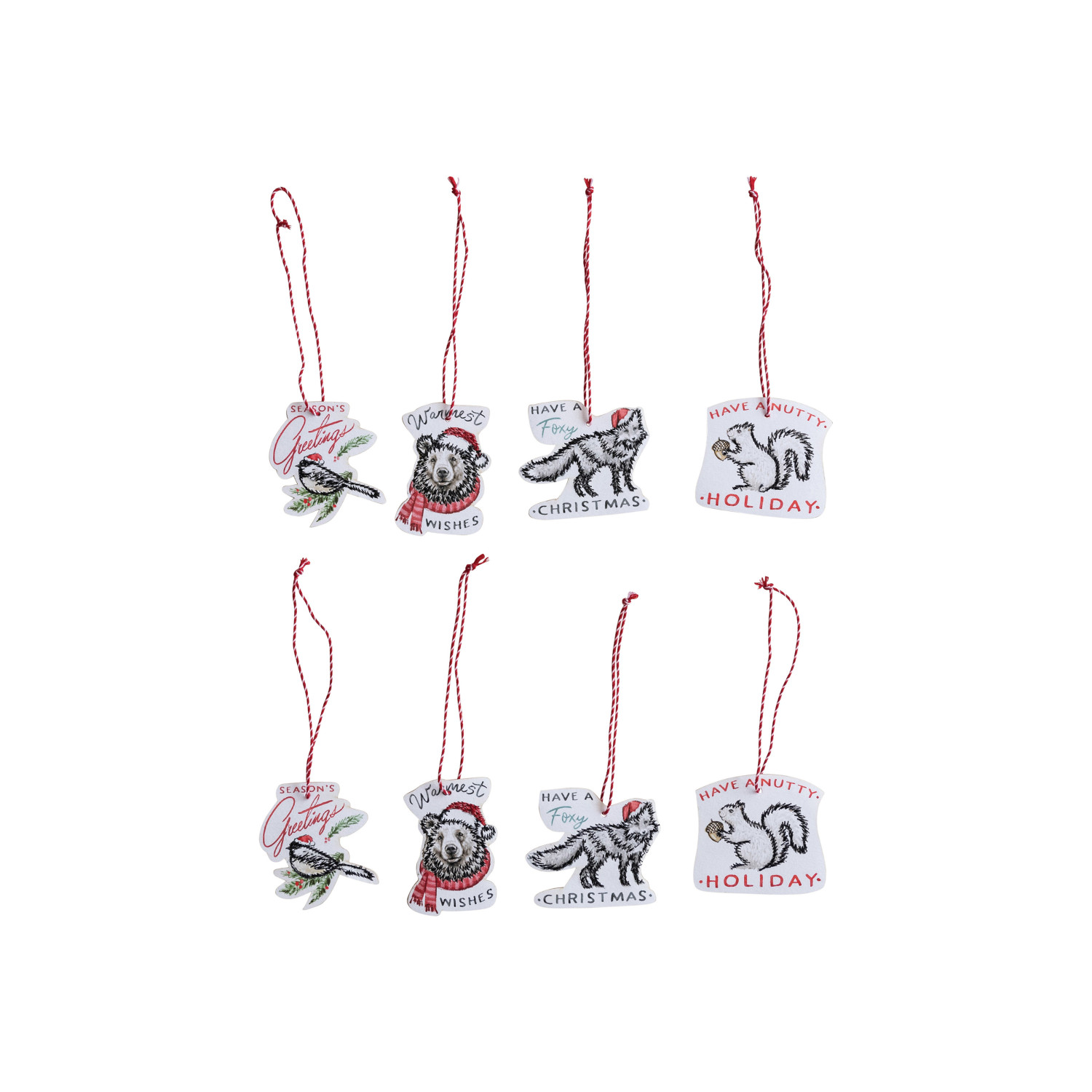 Spread holiday cheer and embrace a sustainable Christmas with this delightful 8-pack paper ornament and gift tag set. Crafted from paper, celebrate holidays in a way that's kind to the planet. Each ornament or gift tag features a unique design, with 4 different styles included in the pack. These charming designs boast a heartwarming holiday saying, a lovable animal illustration, and decorative cotton embroidery accents (designs may vary). Use them to adorn the Christmas tree, personalize holiday gifts, or create festive décor throughout the home, as these versatile ornaments and gift tags are sure to add a touch of whimsy and joy to the holiday season. Each ornament or gift tag measures approximately 5.25 inches high, making them the perfect size for a variety of decorating needs. Celebrate the season in style with this festive 8-pack of ornaments and gift tags. Each ornament/gift tag features a unique design with a charming holiday saying, a lovable animal illustration, and decorative cotton embroidery accents. Perfect for adding a festive touch to the Christmas tree, personalizing gifts, or creating holiday décor.
