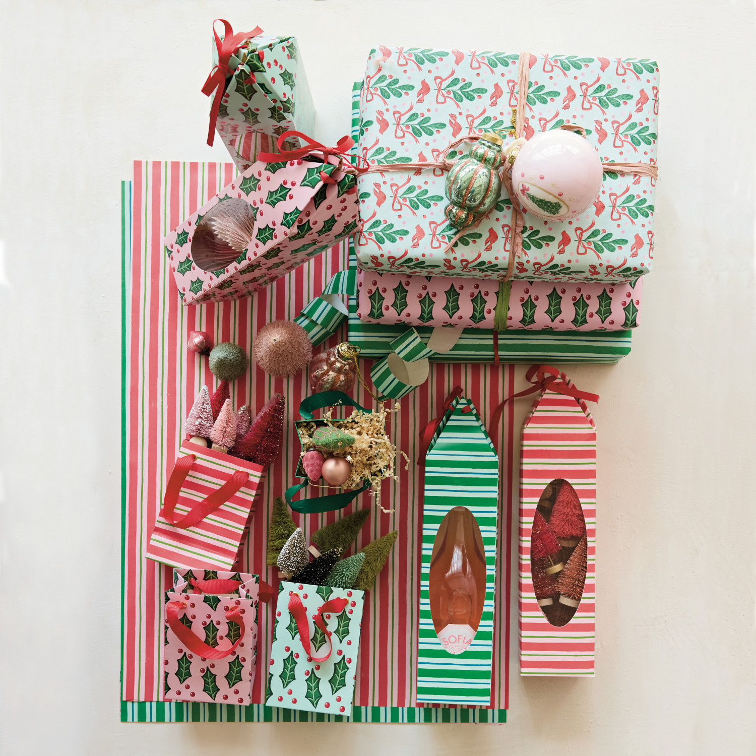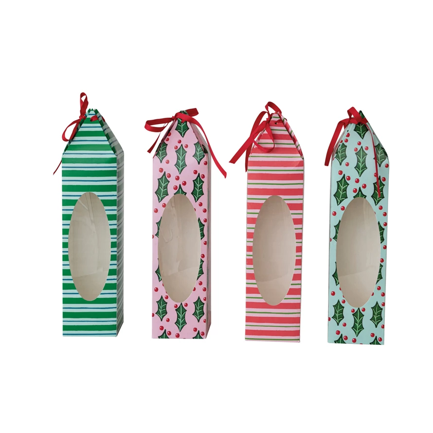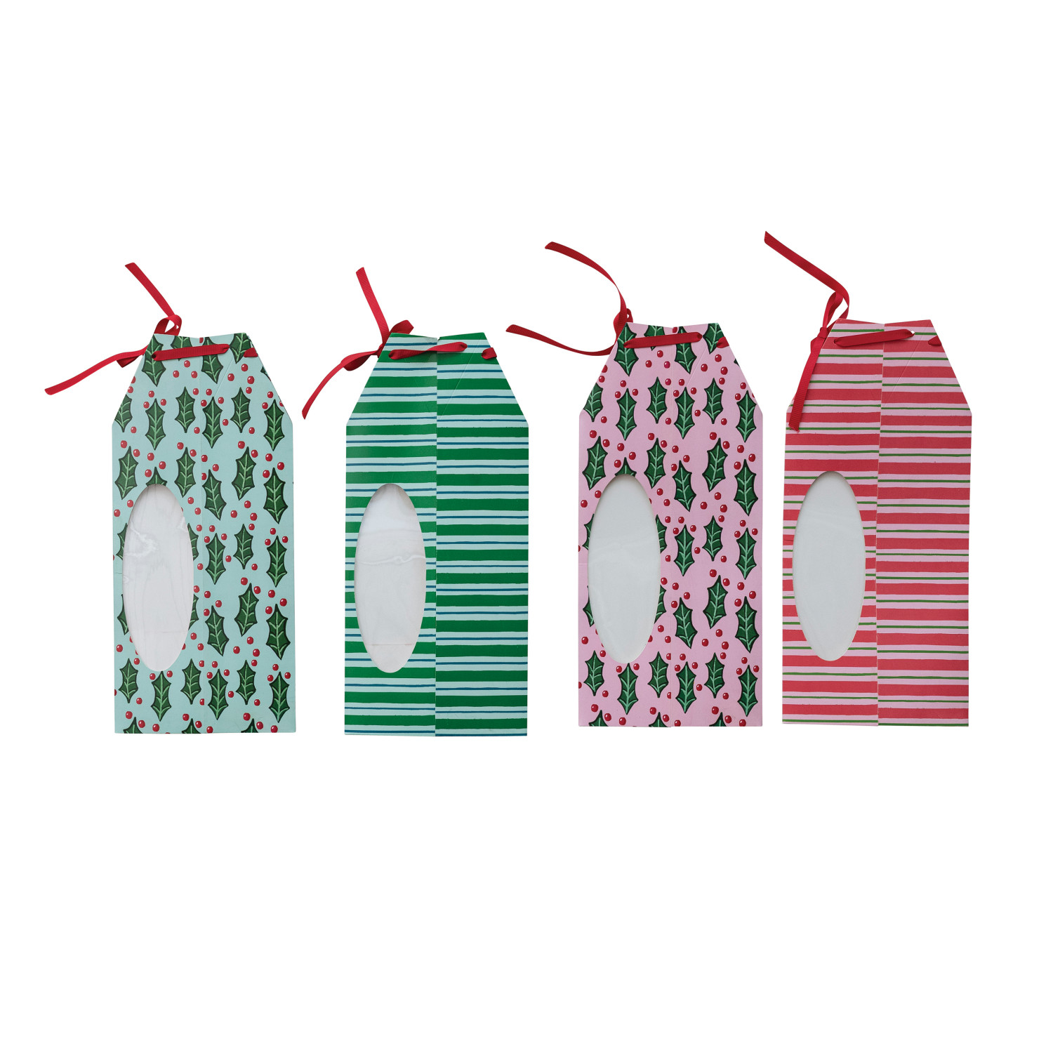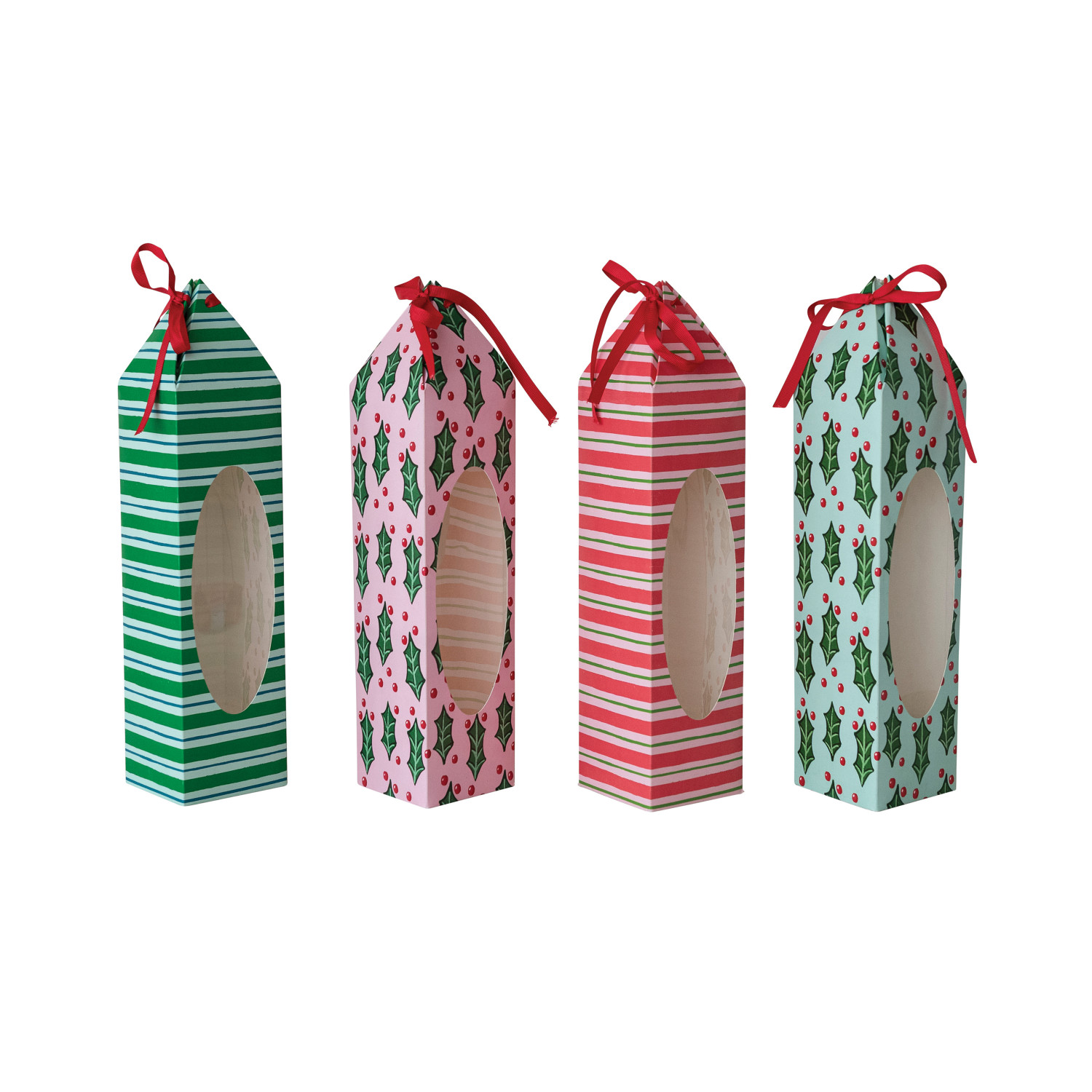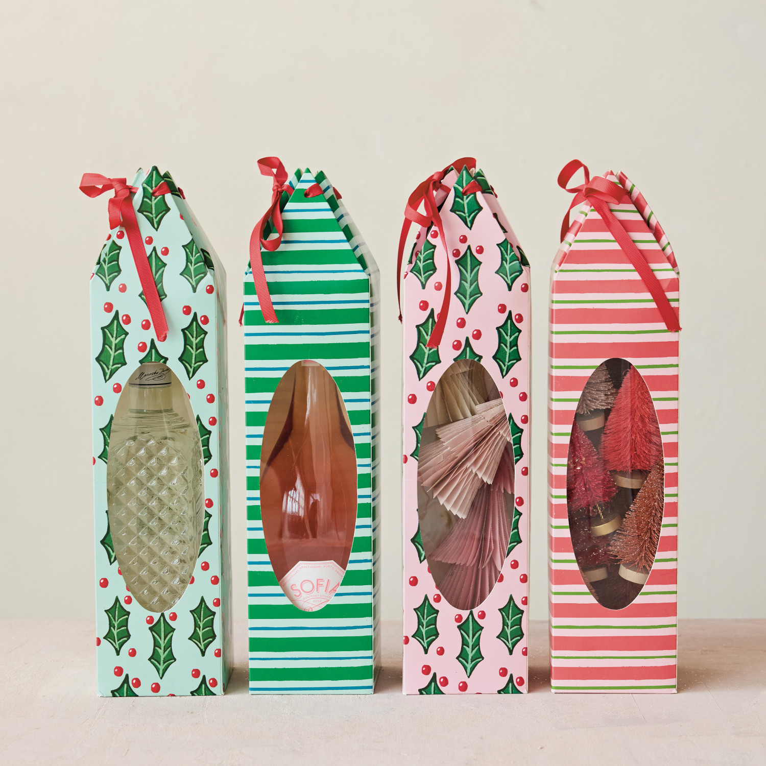 Catalog Name: 3-1/2" Square x 15"H Handmade Printed Recycled Paper Wine/Gift Box w/ Stripes/Botanicals, Acetate Window & Ribbon Ties, Multi Color, 4 Styles ©