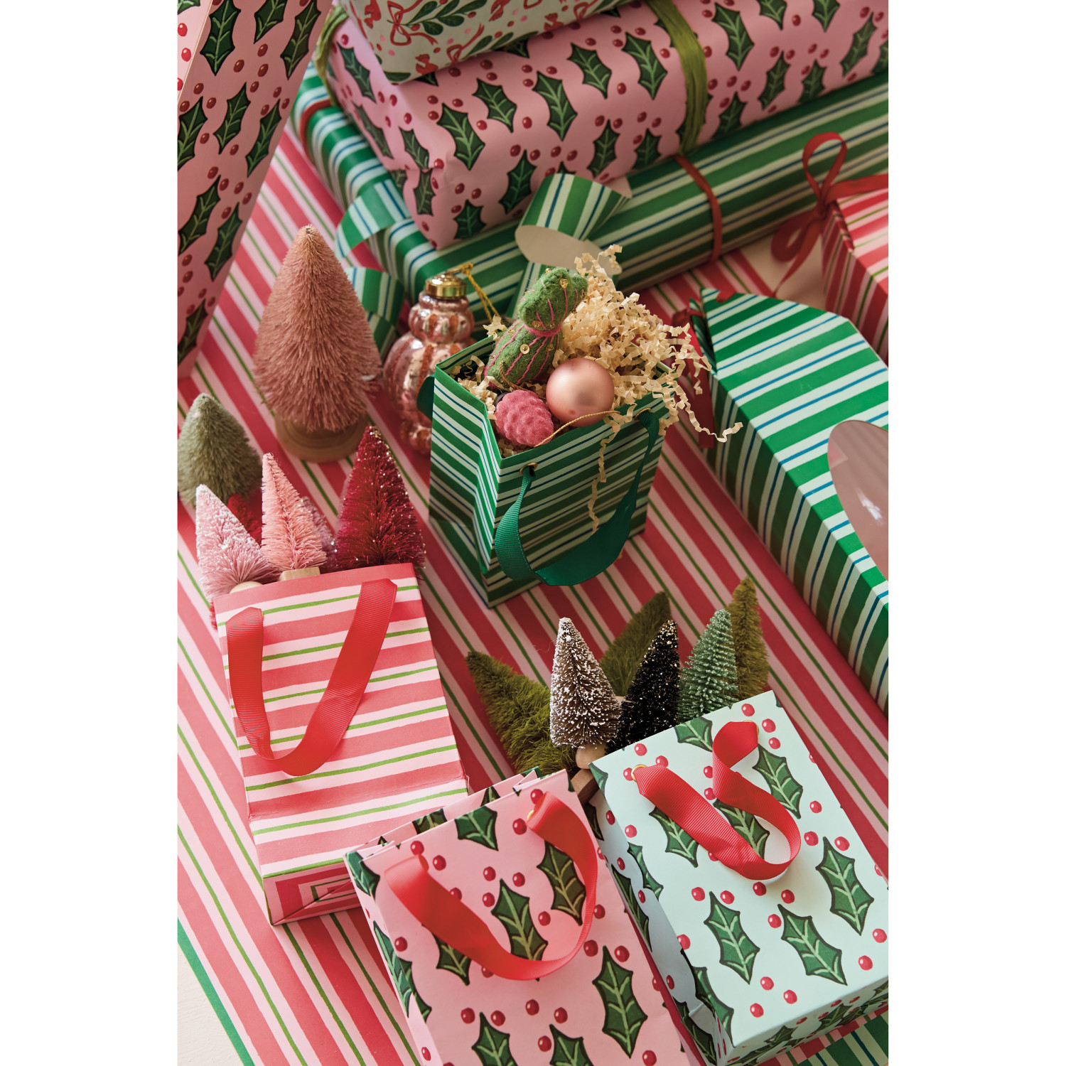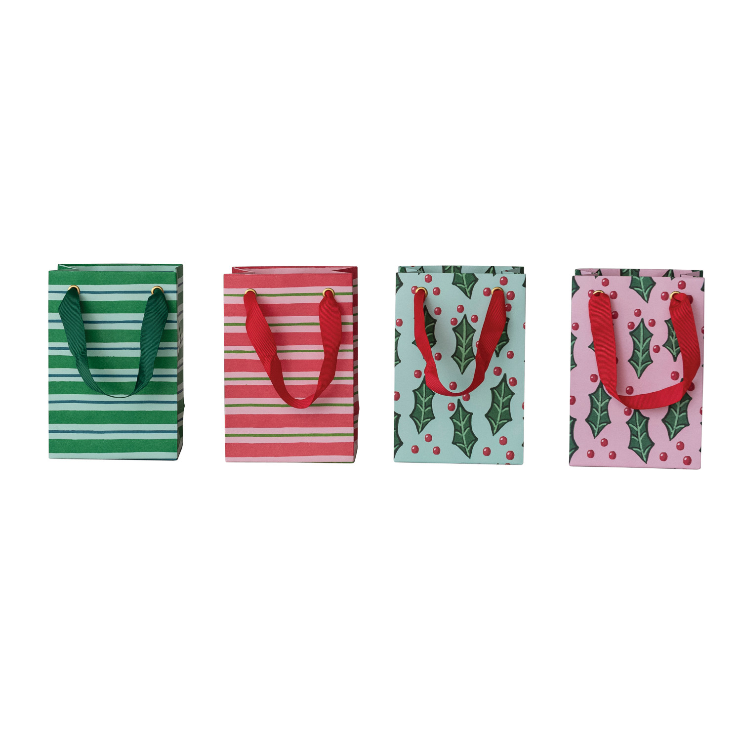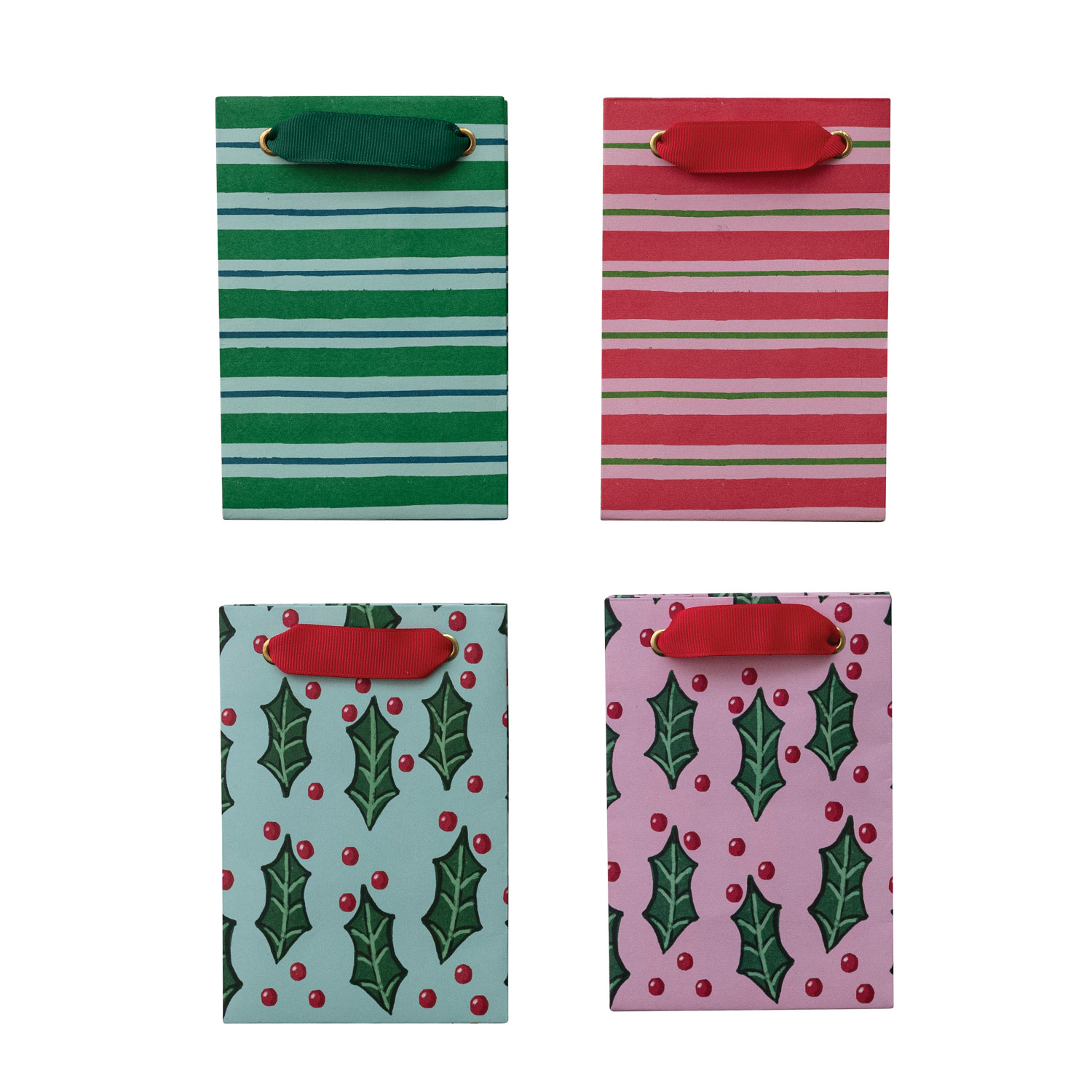 Catalog Name: 4-1/4"L x 2-3/4"W x 6-1/4"H Handmade Printed Recycled Paper Gift Bag w/ Stripes/Botanicals & Grosgrain Ribbon Handles, Multi Color, 4 Styles ©