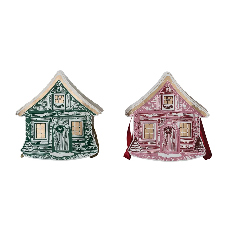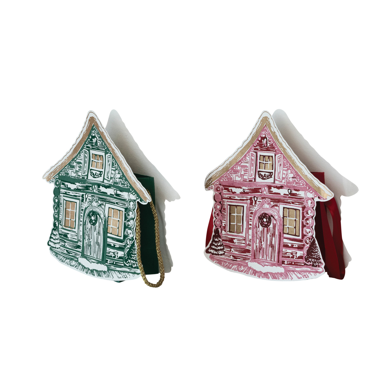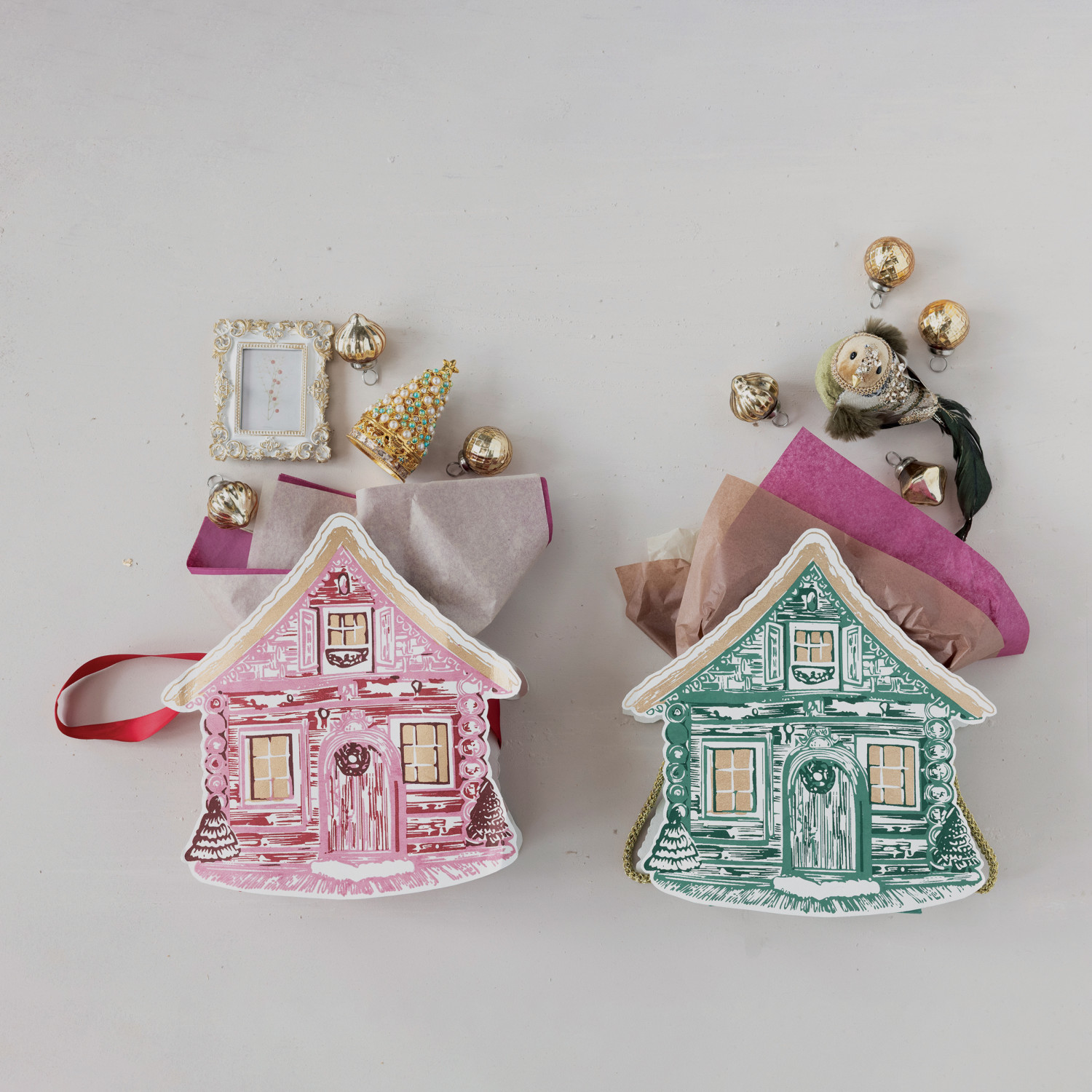 Catalog Name: 5"L x 5-1/2"H Handmade Printed Recycled Paper Cabin Shaped Gift Bag w/ Handle, 2 Colors