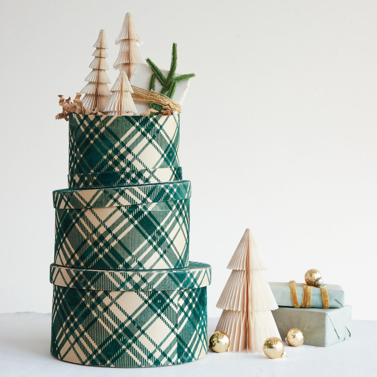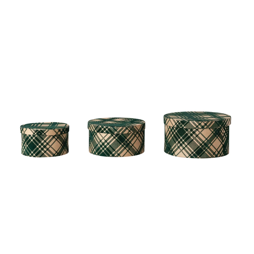 Catalog Name: 10-1/4" Round x 5"H, 8-3/4" Round x 4-1/2"H & 7-1/2" Round x 4"H Handmade Printed Recycled Flocked Kraft Paper Nesting Gift Boxes w/ Plaid Pattern, Green, Set of 3