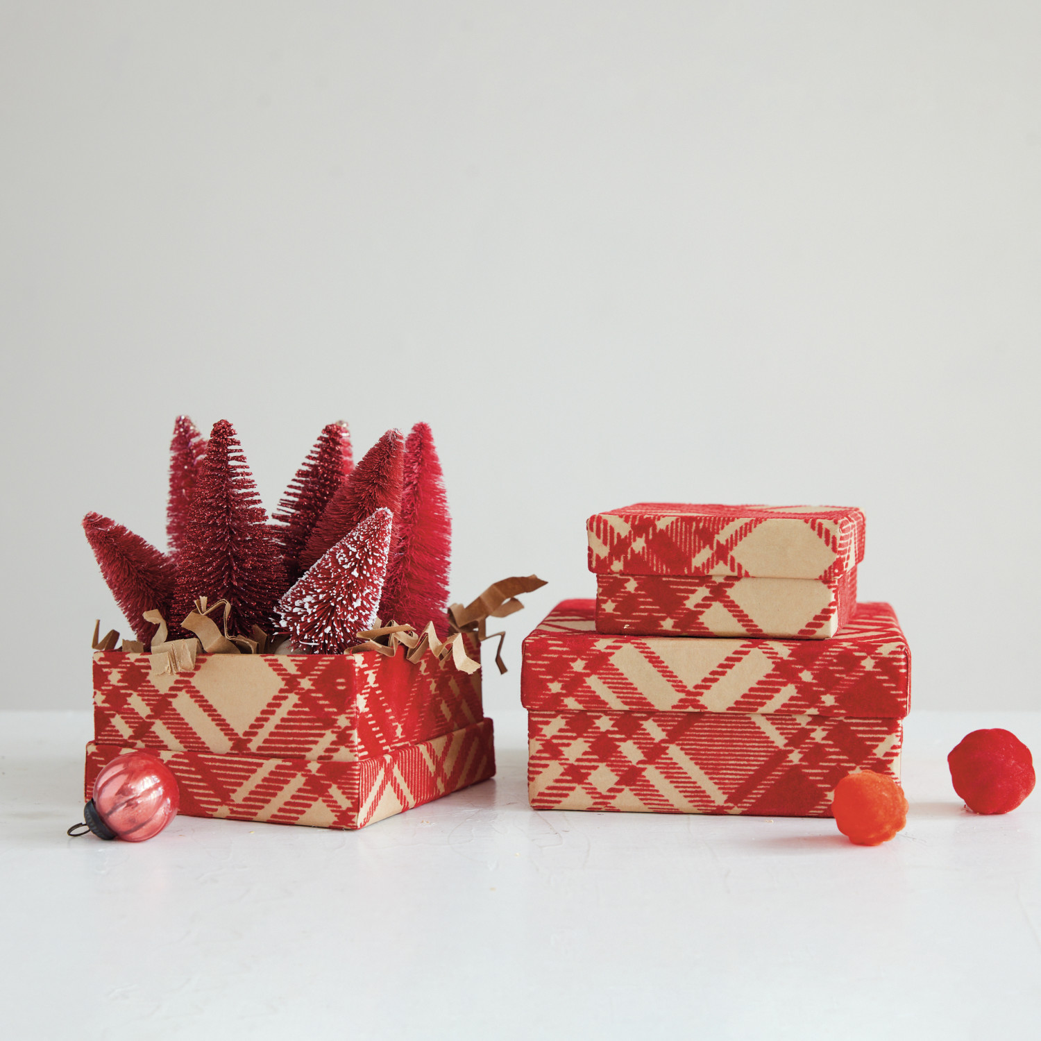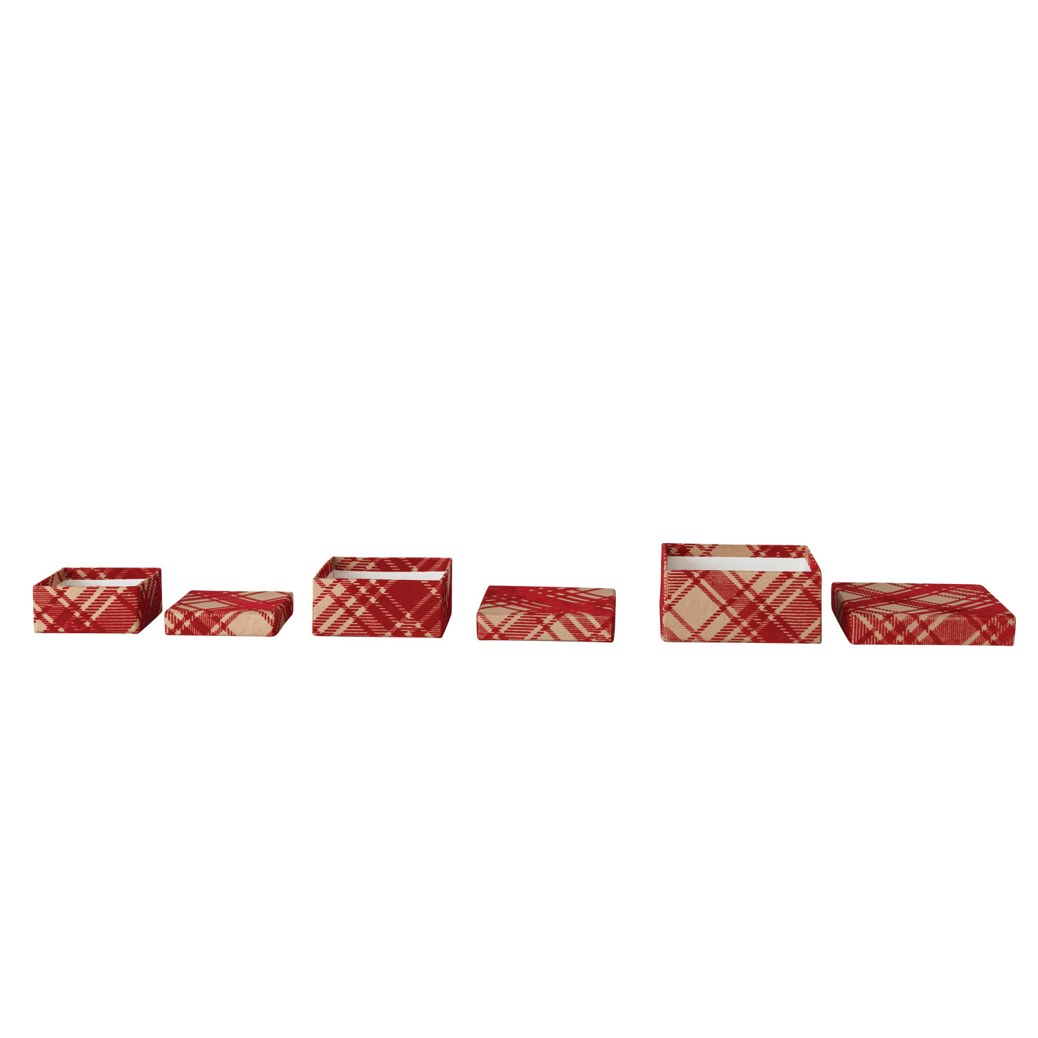 Catalog Name: 5-3/4" Square x 2-3/4"H, 4-3/4" Square x 2-1/4"H & 4" Square x 1-3/4"H Handmade Printed Recycled Flocked Kraft Paper Nesting Gift Boxes w/ Plaid Pattern, Red, Set of 3