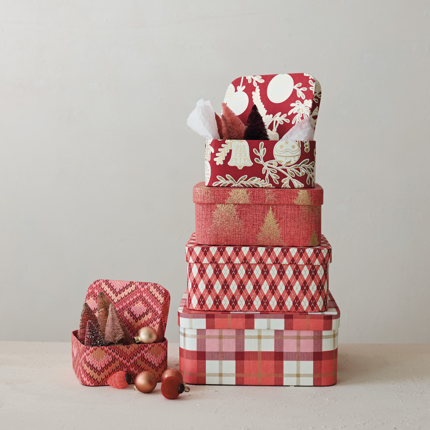 Catalog Name: 10-1/2" Square x 4-1/2"H, 9-1/2" Square x 4"H, 8-1/2" Square x 3-1/2"H, 7-1/2" Square x 3"H & 6" Square x 2-1/2"H Handmade Printed Recycled Paper Gift Boxes w/ Pattern, Multi Color, Set of 5