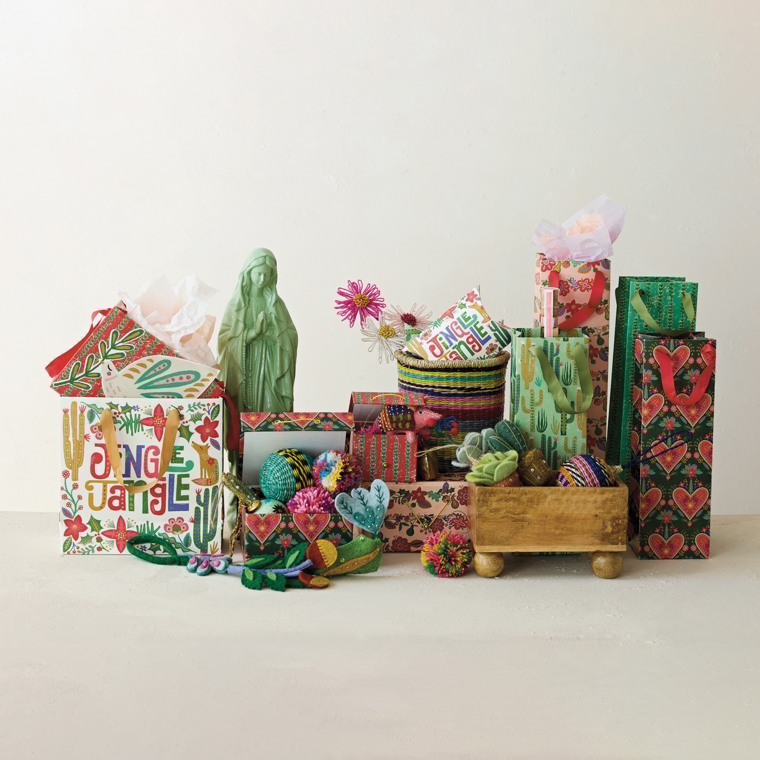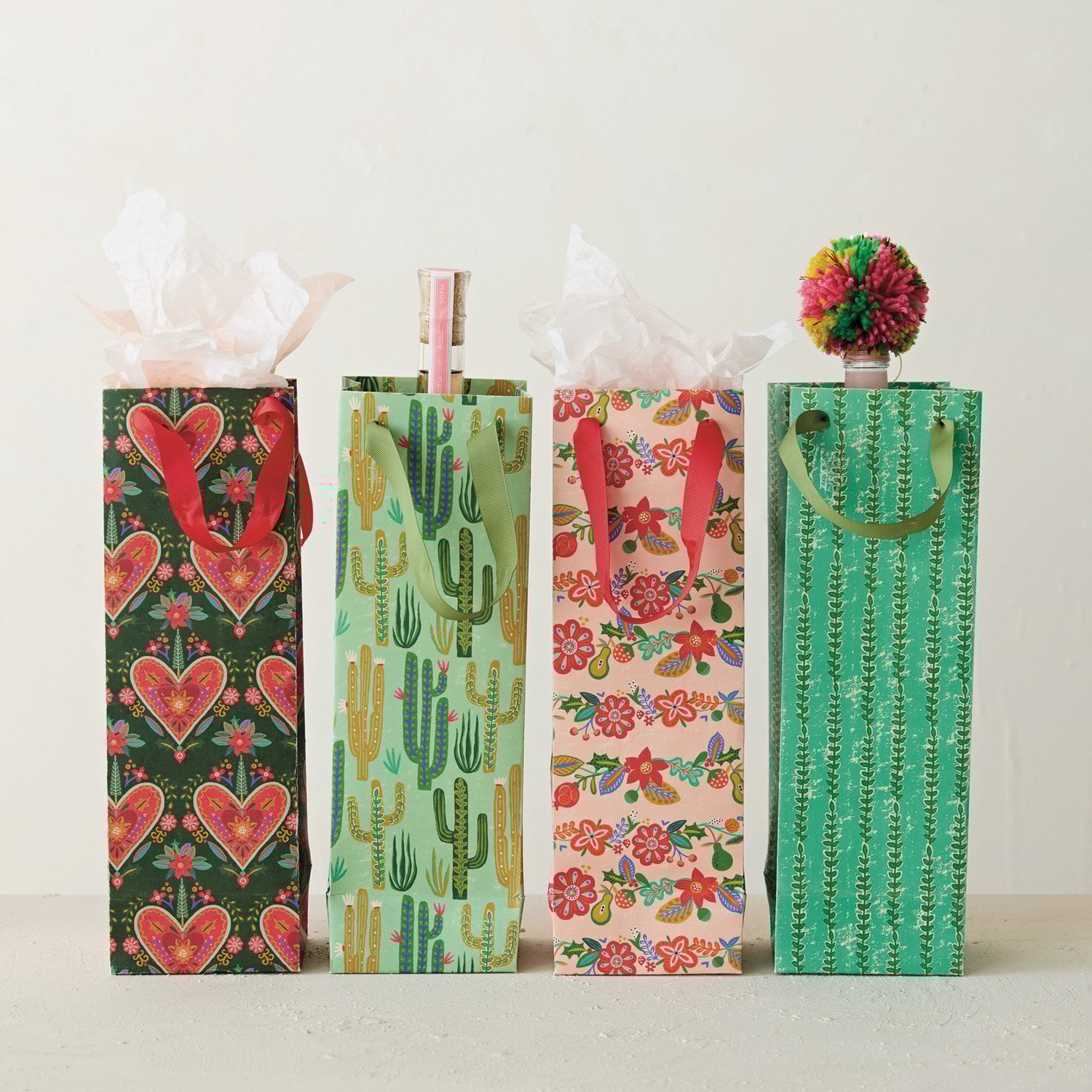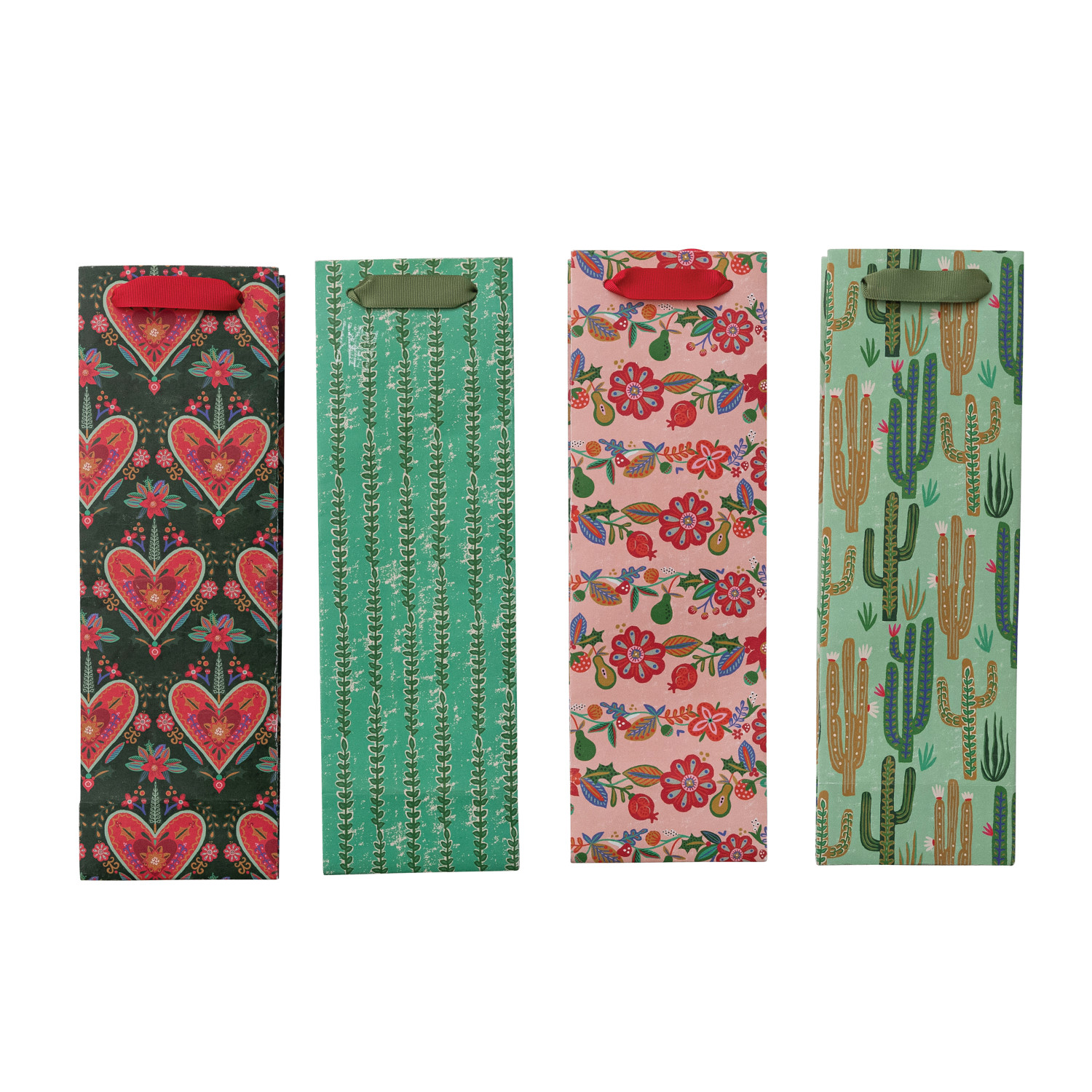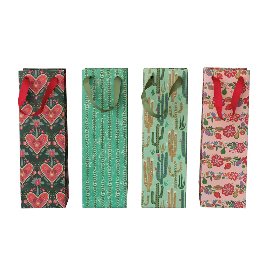 Catalog Name: 4-1/2"L x 3-3/4"W x 14"H Handmade Printed Recycled Paper Wine/Gift Bag w/ Seasonal Pattern & Grosgrain Ribbon Handles, Multi Color, 4 Styles ©