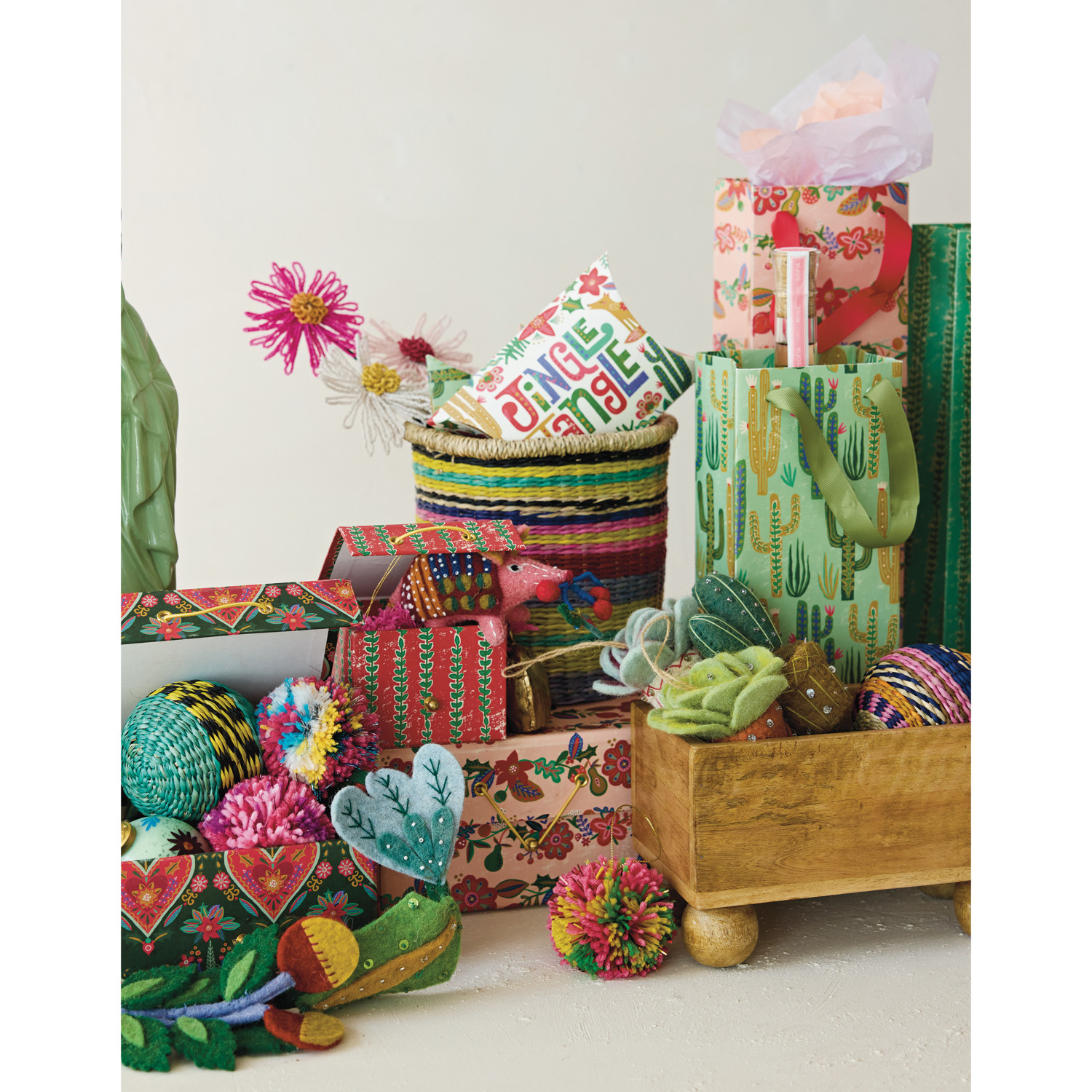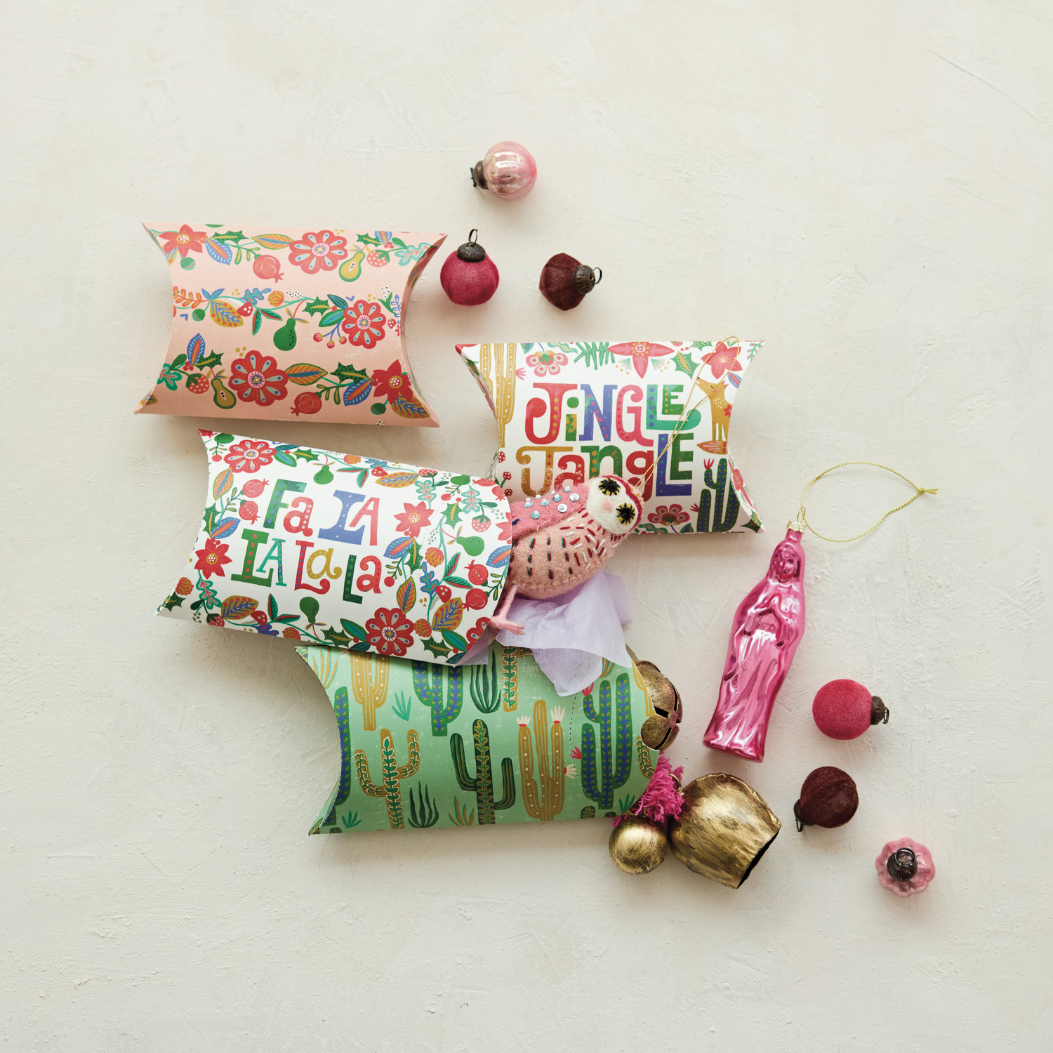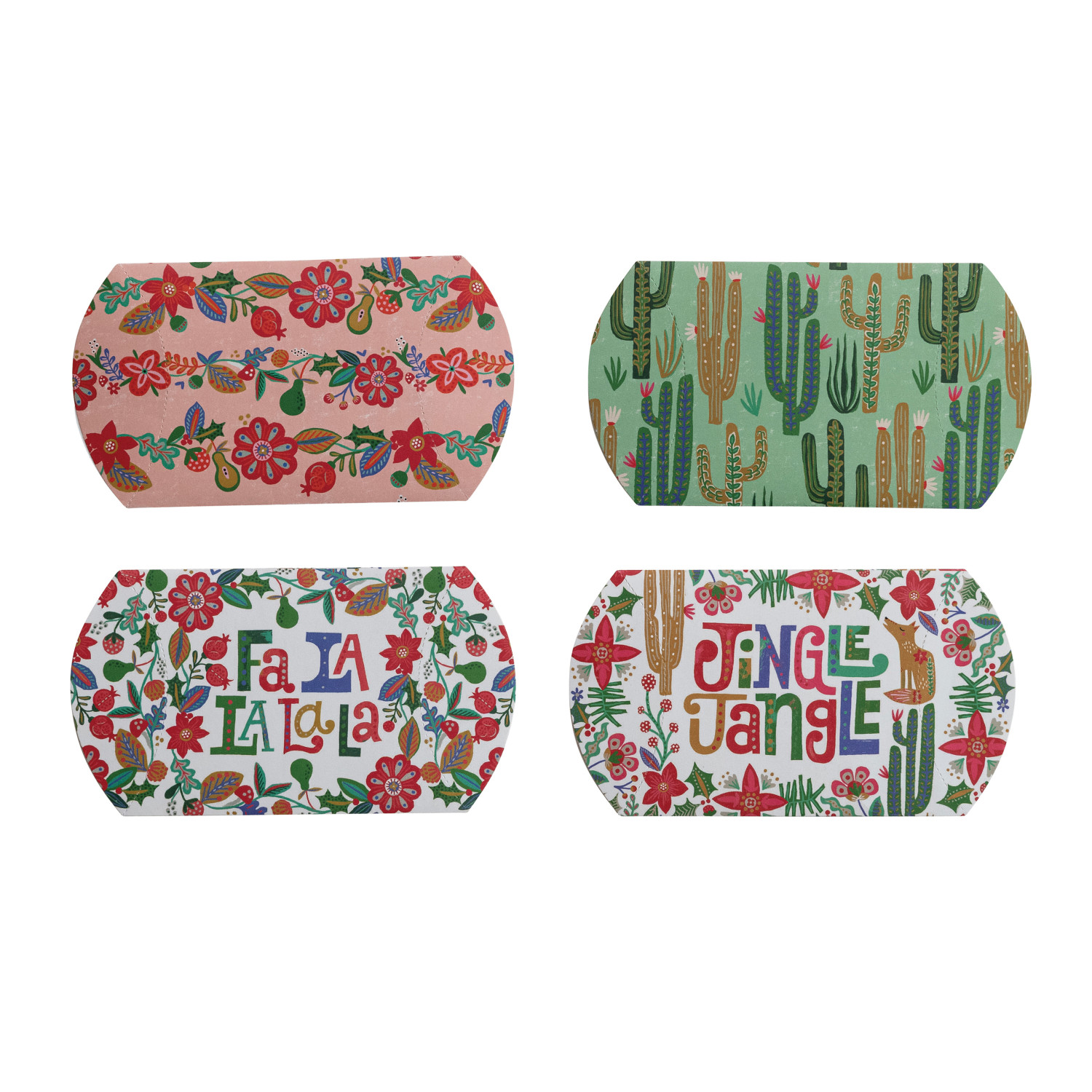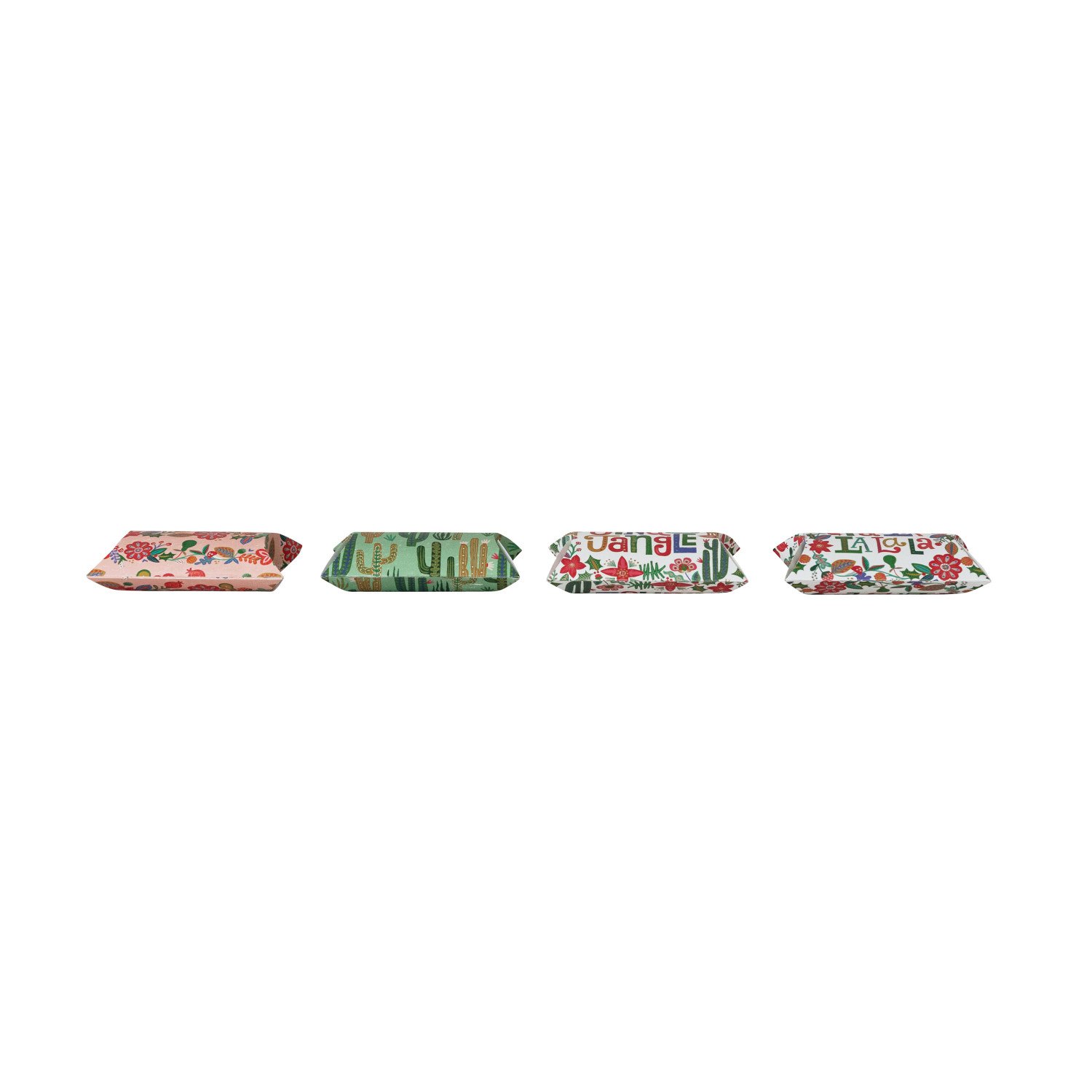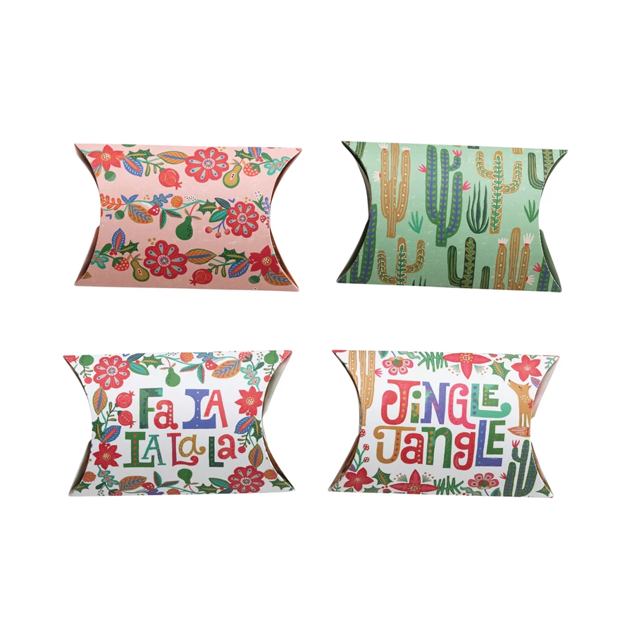 Catalog Name: 6-3/4"L x 4-1/4"W x 1-1/2"H Handmade Printed Recycled Paper Pillow Gift Box w/ Seasonal Pattern & "Fa La La La La"/"Jingle Jangle", Multi Color, 4 Styles ©