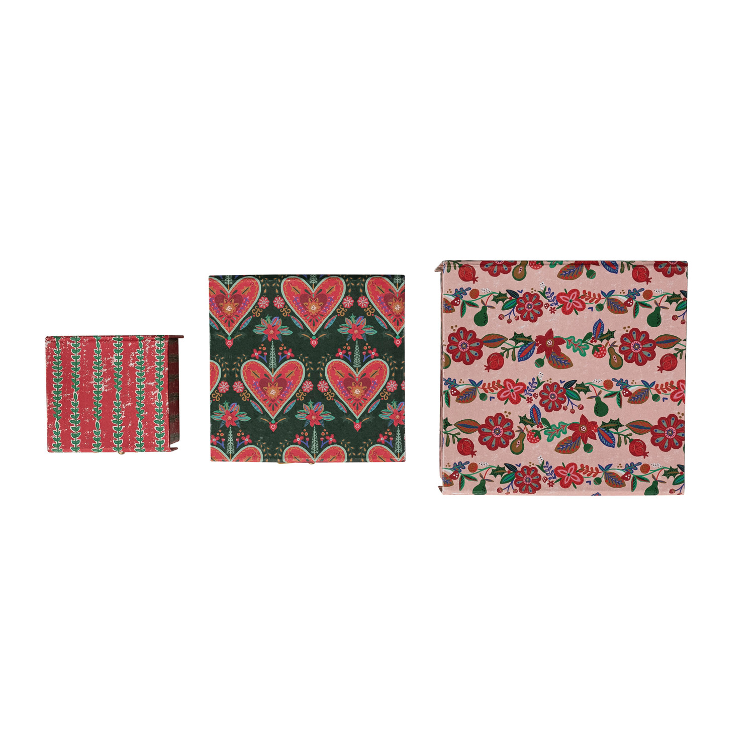 Catalog Name: 8-1/2" Square x 4-1/2"H, 7" Square x 6-3/4"H & 4-1/2" Square x 3"H Handmade Printed Recycled Paper Gift Boxes w/ Seasonal Patterns & Closures, Multi Color, Set of 3 ©