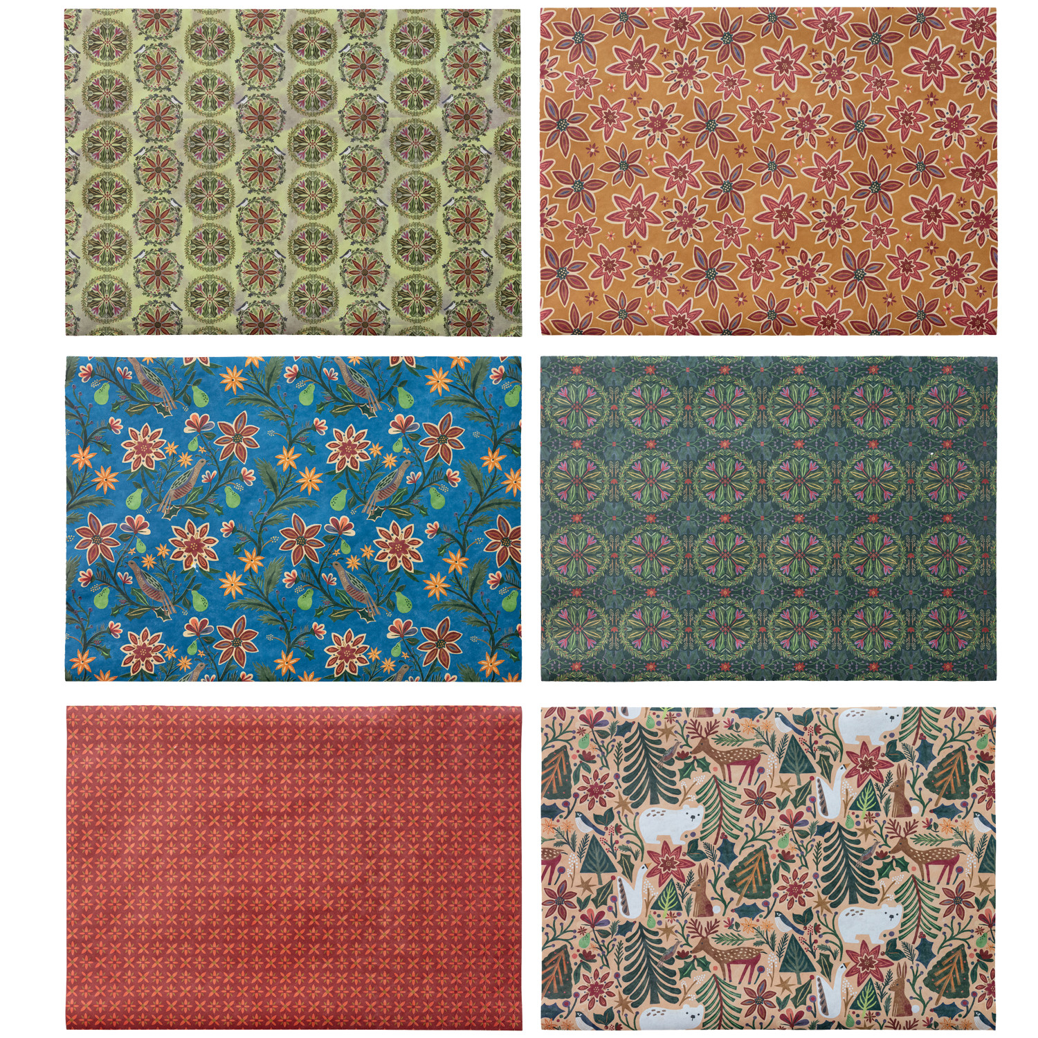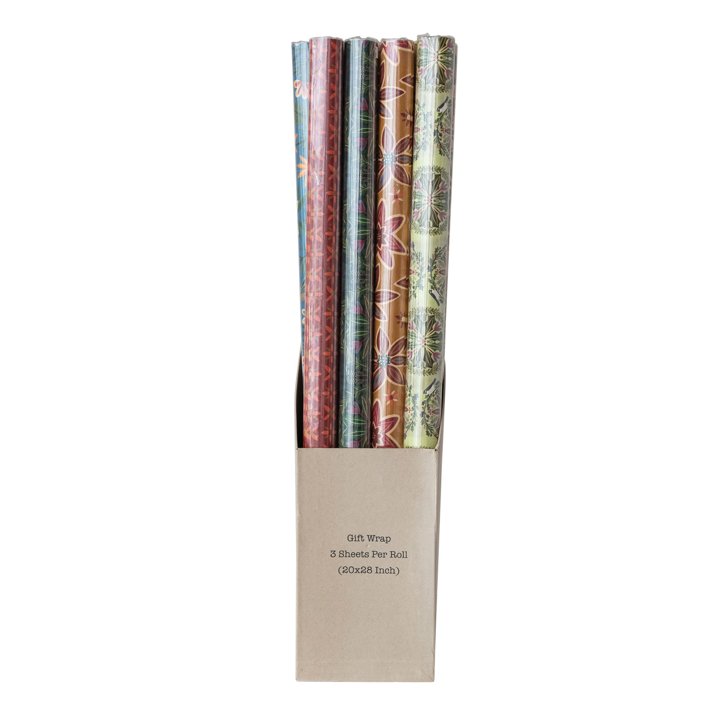 Catalog Name: 28"L x 20"W Handmade Printed Recycled Wrapping Paper Sheets w/ Patterns, Multi Color, Set of 12 Rolls in Kraft Display Box (6 Styles, 2 Rolls Per Style, 3 Sheets Per Roll) ©