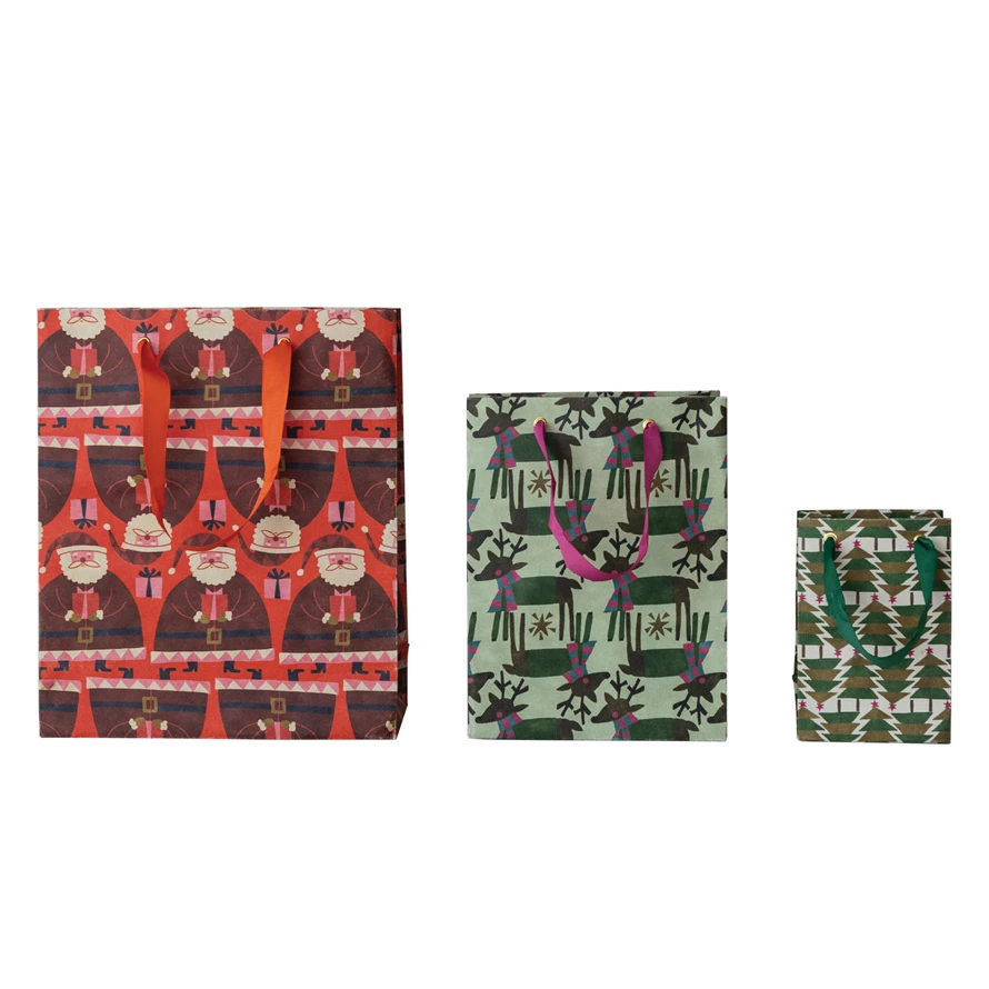 Catalog Name: 10"L x 4"W x 12"H, 7-1/4"L x 3-1/2"W x 9-1/2"H & 4-1/4"L x 2-3/4"W x 6-1/4"H Handmade Printed Recycled Paper Gift Bags w/ Holiday Patterns & Grosgrain Ribbon Handles, Multi Color, Set of 3 ©
