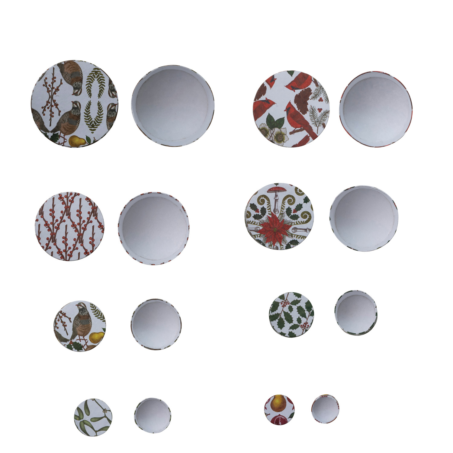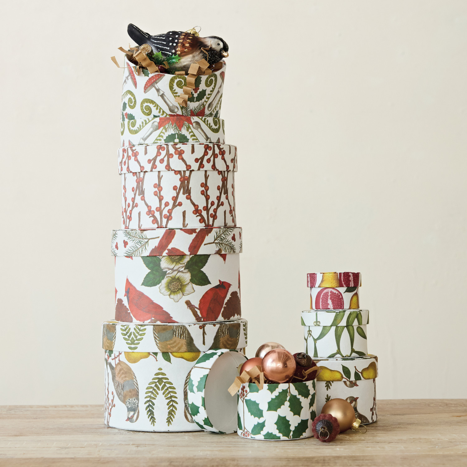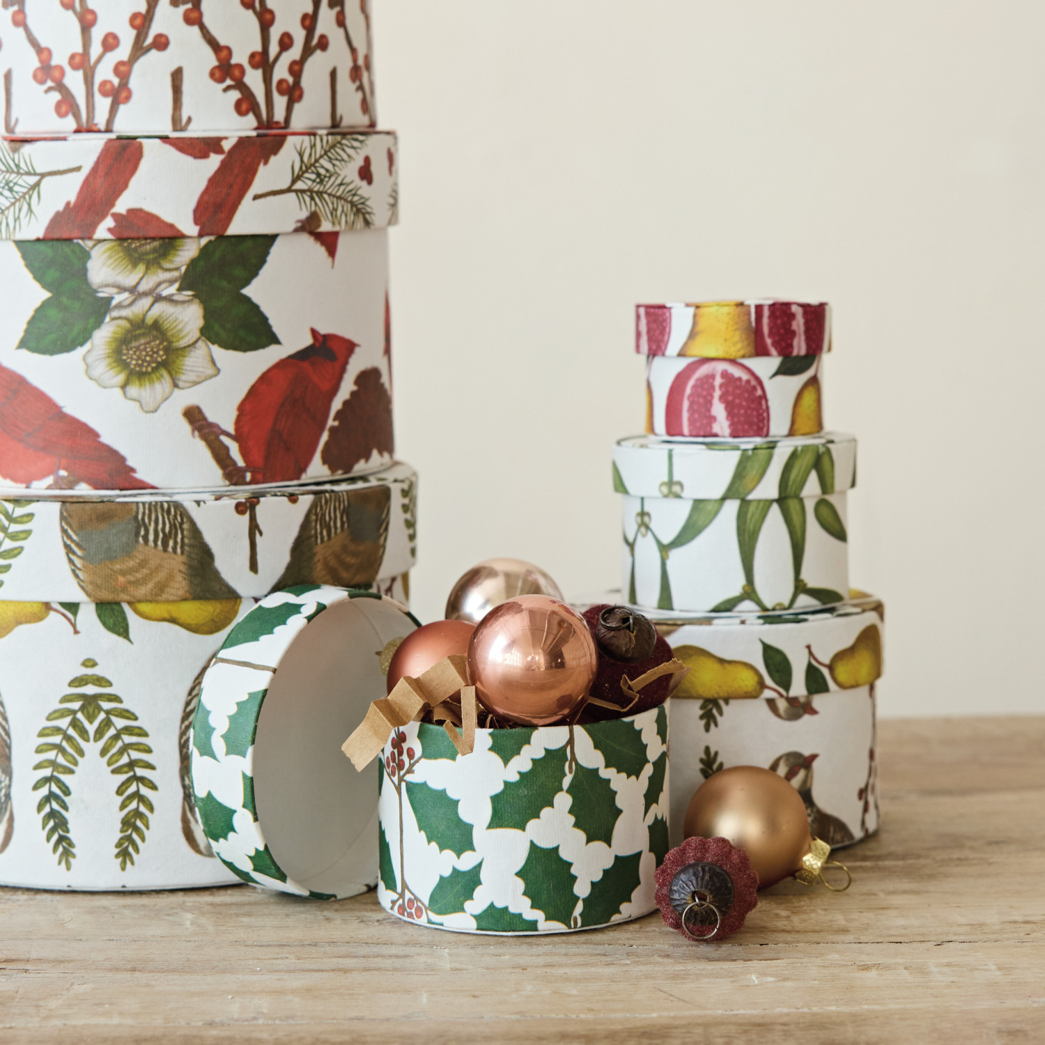 Catalog Name: 2-1/4" Round - 6-1/4" Round Handmade Printed Recycled Paper Nesting Gift Boxes w/ Seasonal Botanicals/Animals Patterns, Multi Color, Set of 8 ©
