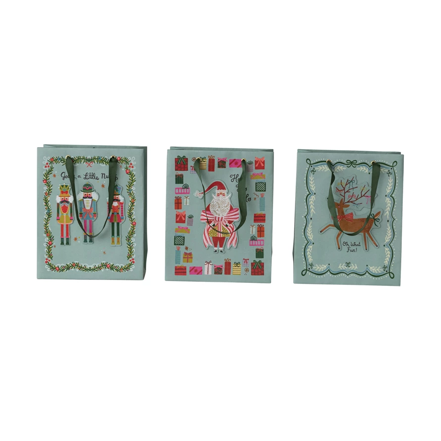 Catalog Name: 8-1/2"L x 4"W x 10-1/2"H Handmade Printed Recycled Paper Gift Bag w/ 3D Holiday Image, Saying & Green Grosgrain Ribbon Handles, Multi Color, 3 Styles ©
