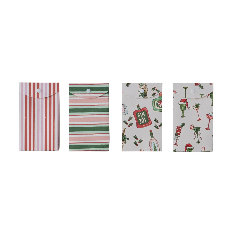 Catalog Name: 3-1/2"L x 1-1/4"W x 6"H Handmade Printed Recycled Paper Gift Envelope w/ Cocktail/Bottle/Stripes Pattern & Snap Closure, Multi Color, 4 Styles ©