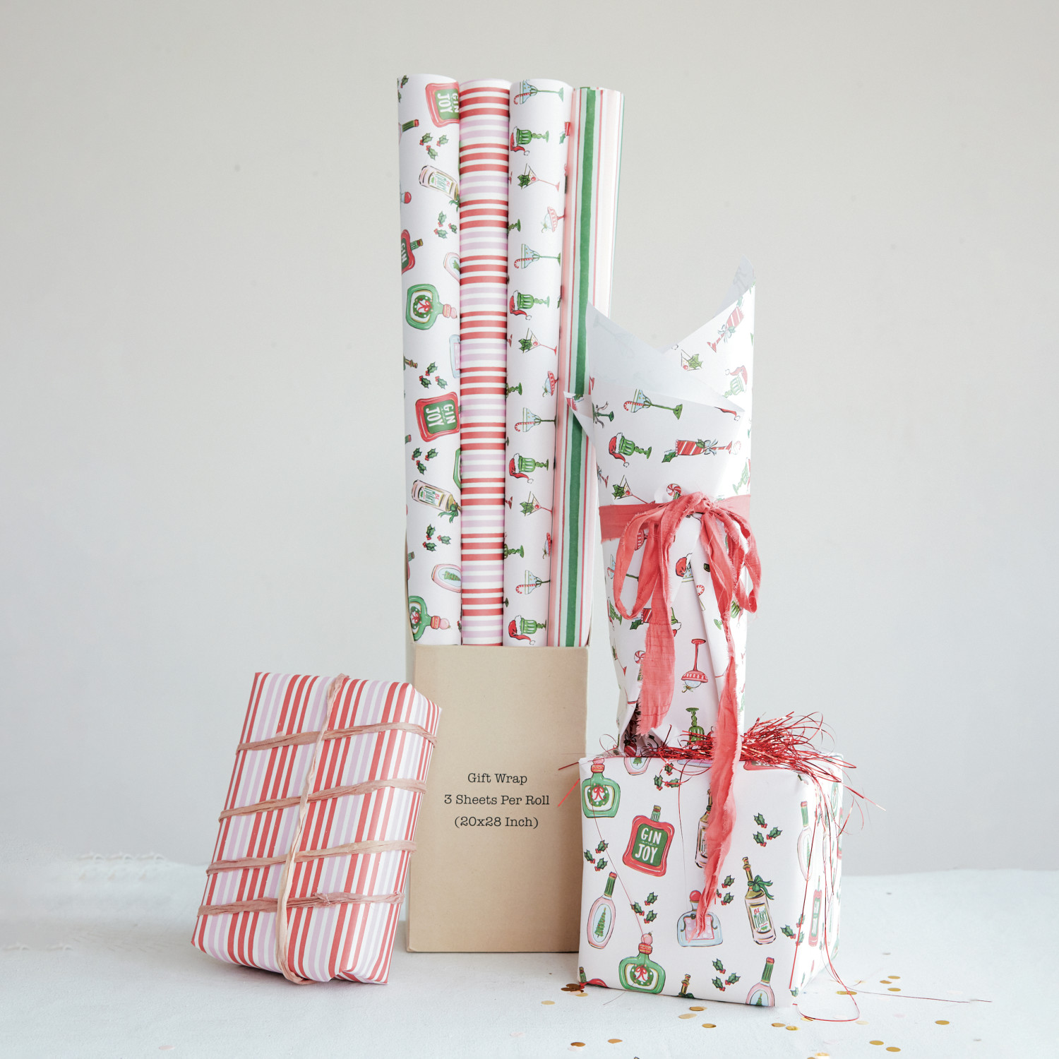 Catalog Name: 28"L x 20"W Handmade Printed Recycled Wrapping Paper Sheets w/ Cocktail/Stripes Pattern, Multi Color, Set of 12 Rolls in Kraft Display Box (4 Styles, 3 Rolls Per Style, 3 Sheets Per Roll) ©
