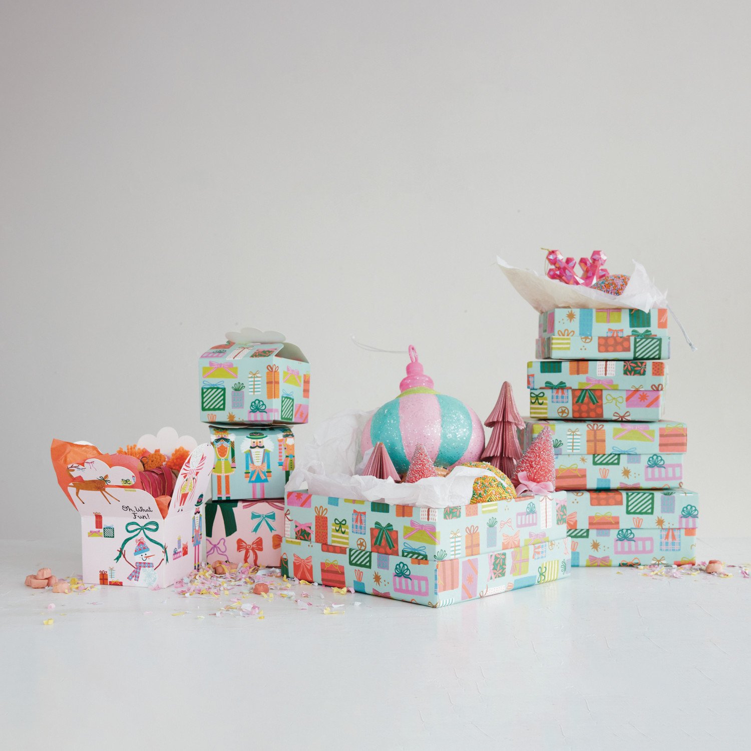 Catalog Name: 4" Square x 3"H Handmade Printed Recycled Paper Interlocking Gift Box w/ Holiday Pattern, Multi Color, 4 Styles ©
