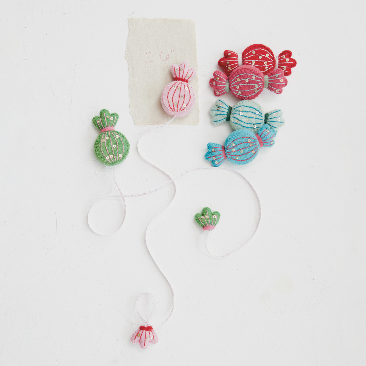 Catalog Name: 5"L x 2-1/4"W Handmade Embroidered Wool Felt Candy Shaped Tape Measure w/ Sequins & Beads, Multi Color, 6 Styles (Each Measures 5 Feet)