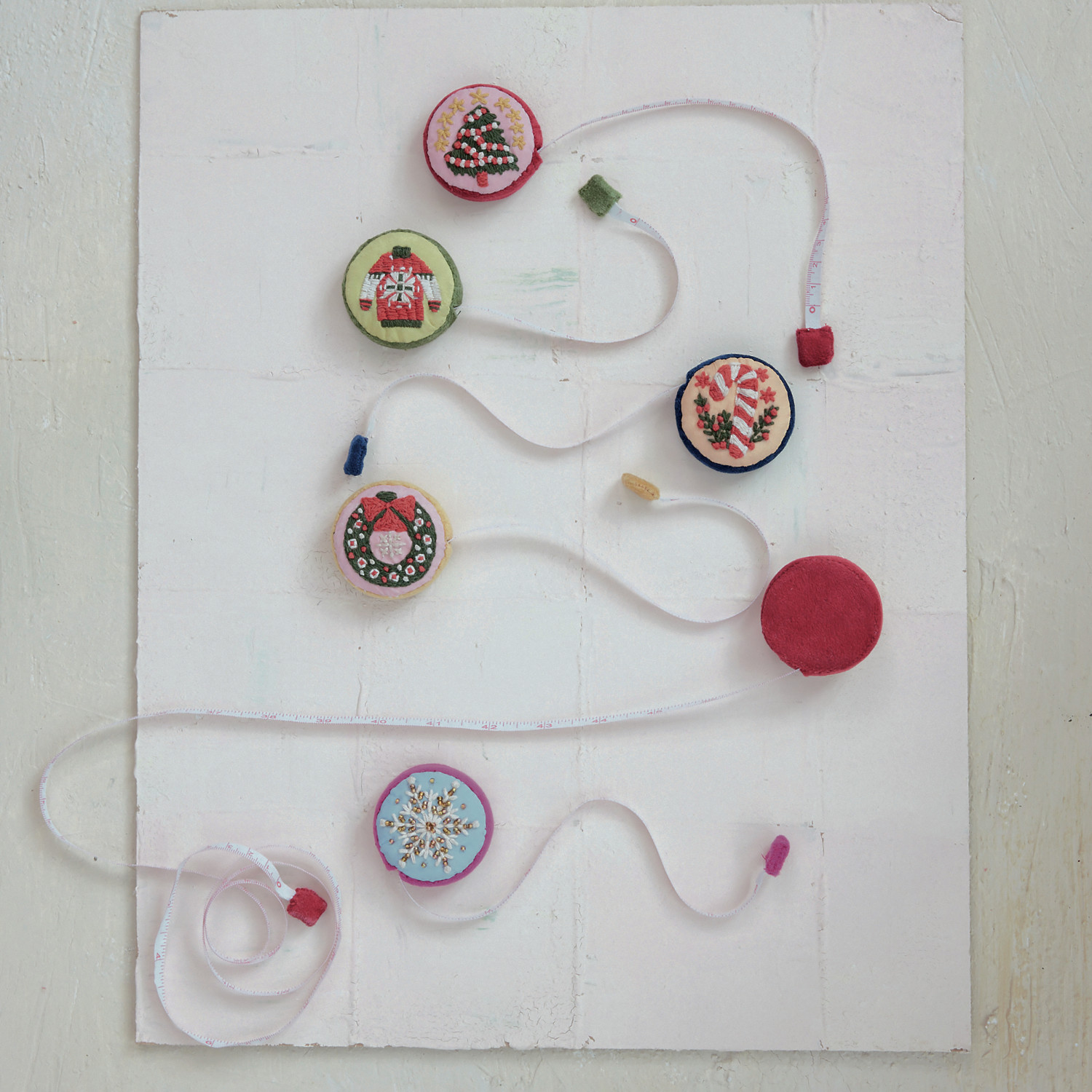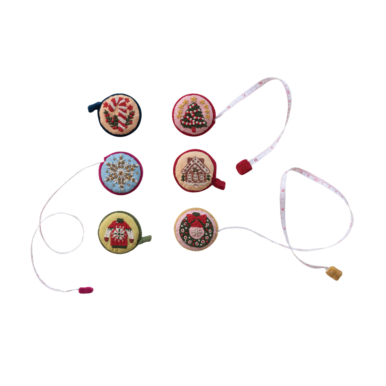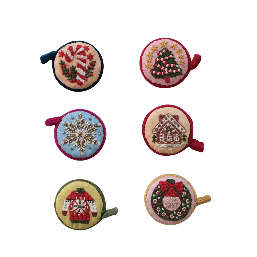 Catalog Name: 2" Round Handmade Embroidered Fabric Tape Measure w/ Holiday Image, Multi Color, 6 Styles (Each Measures 5 Feet)
