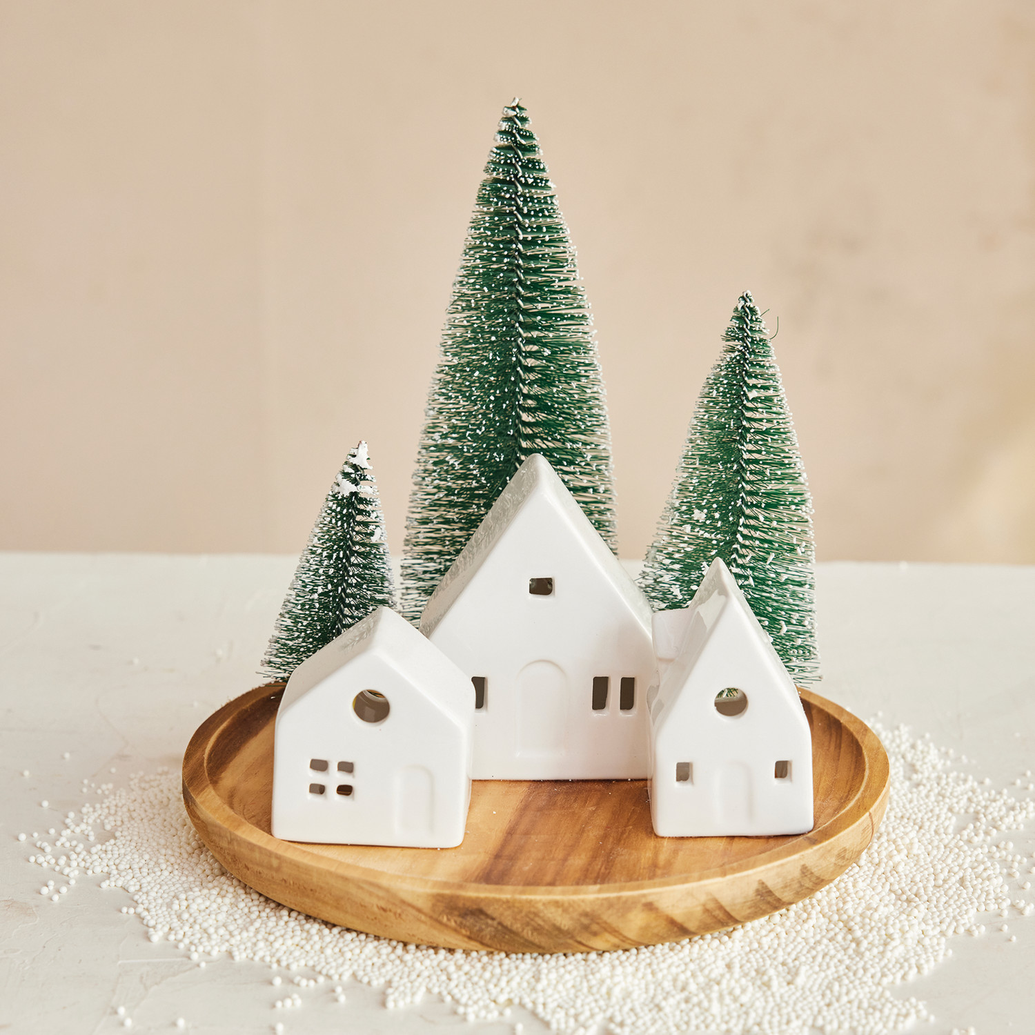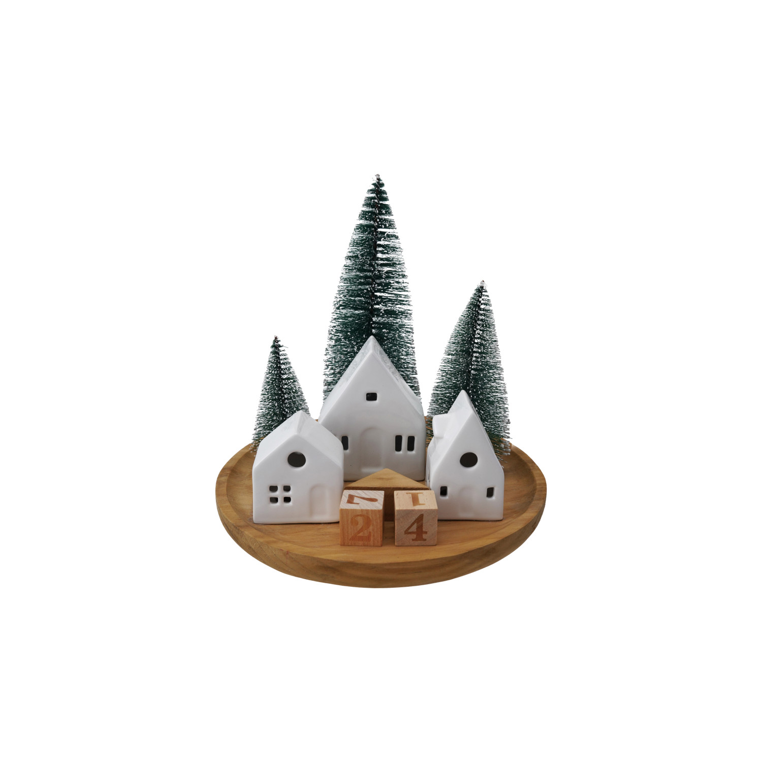 Stoneware Houses & Bottle Brush Trees with LED Light & Wood Base