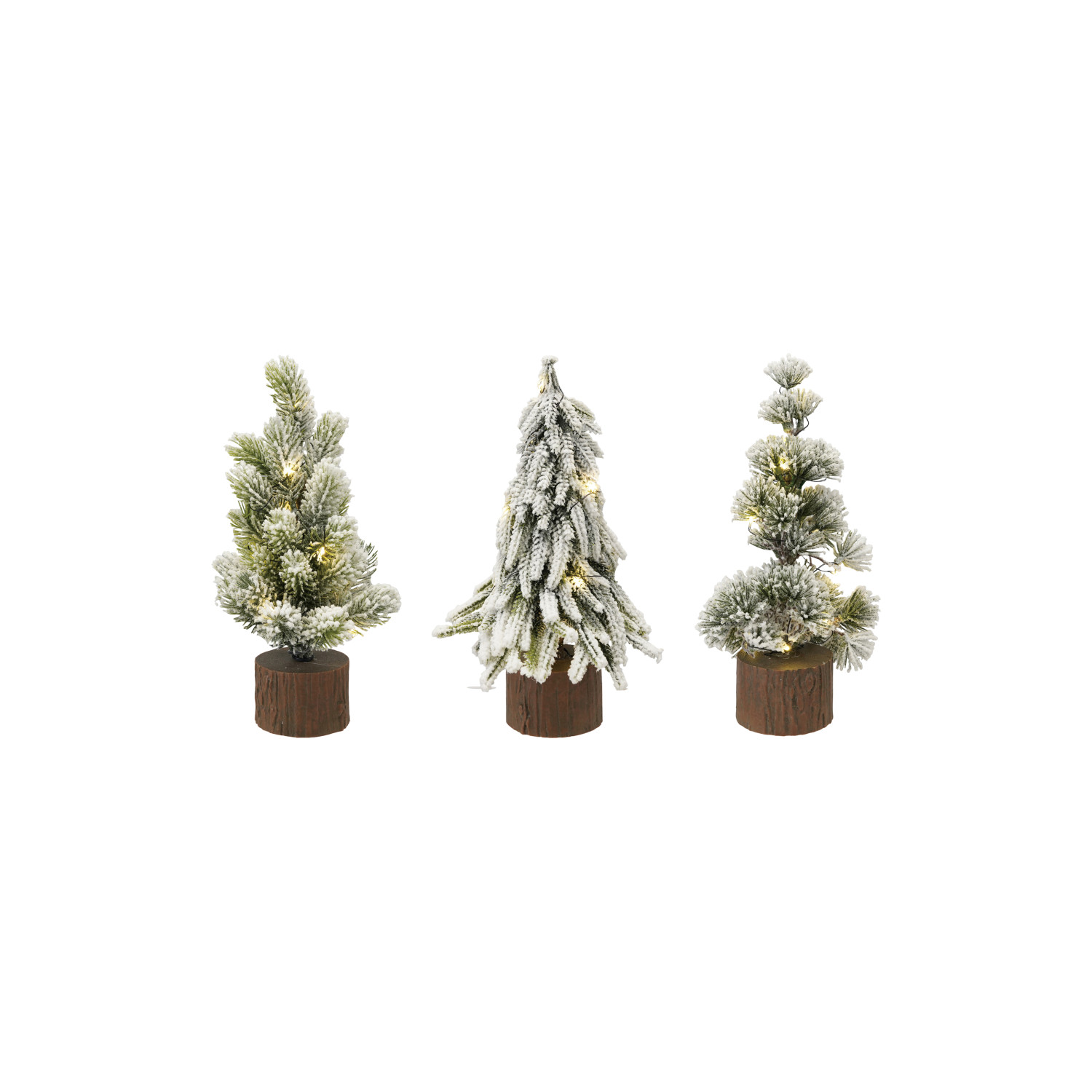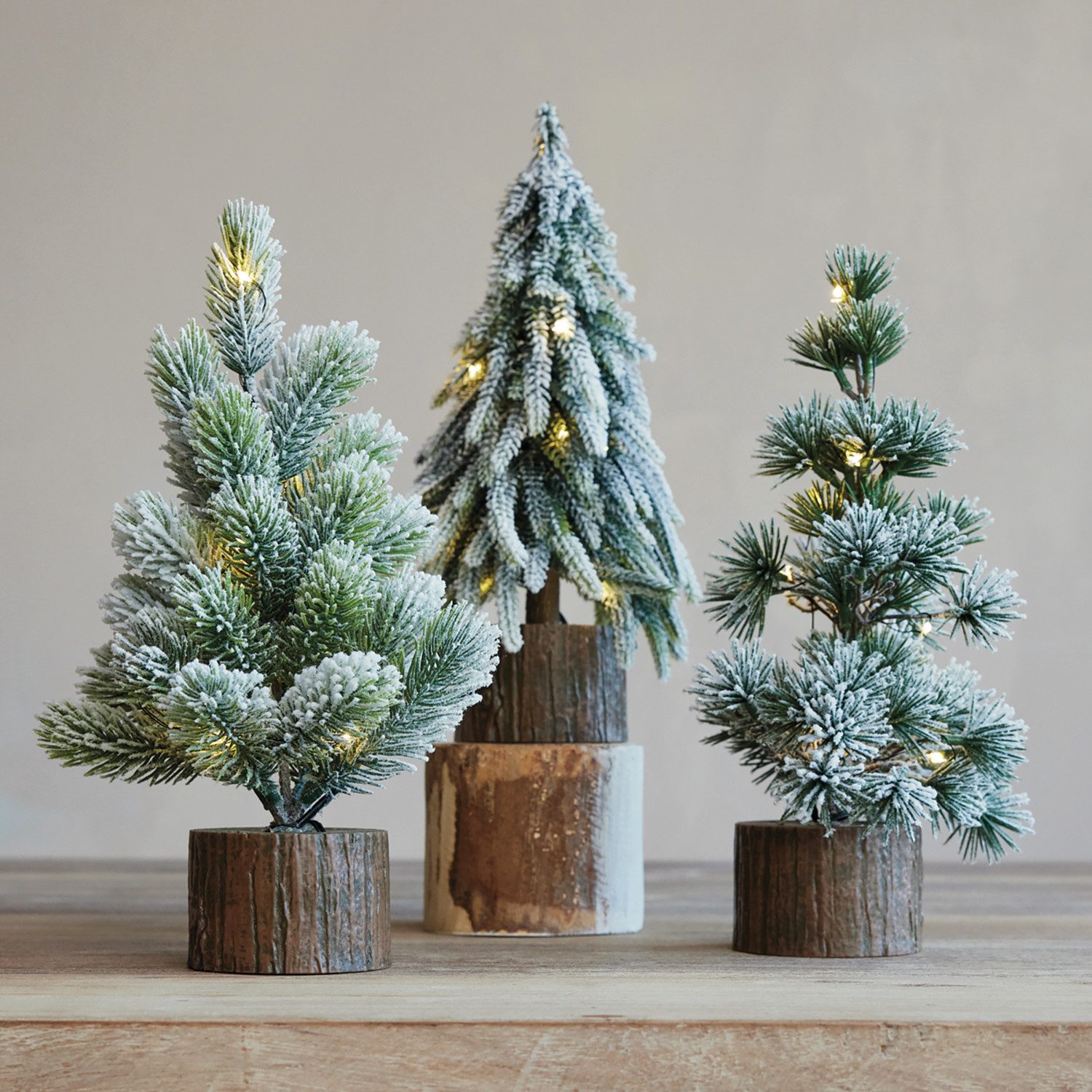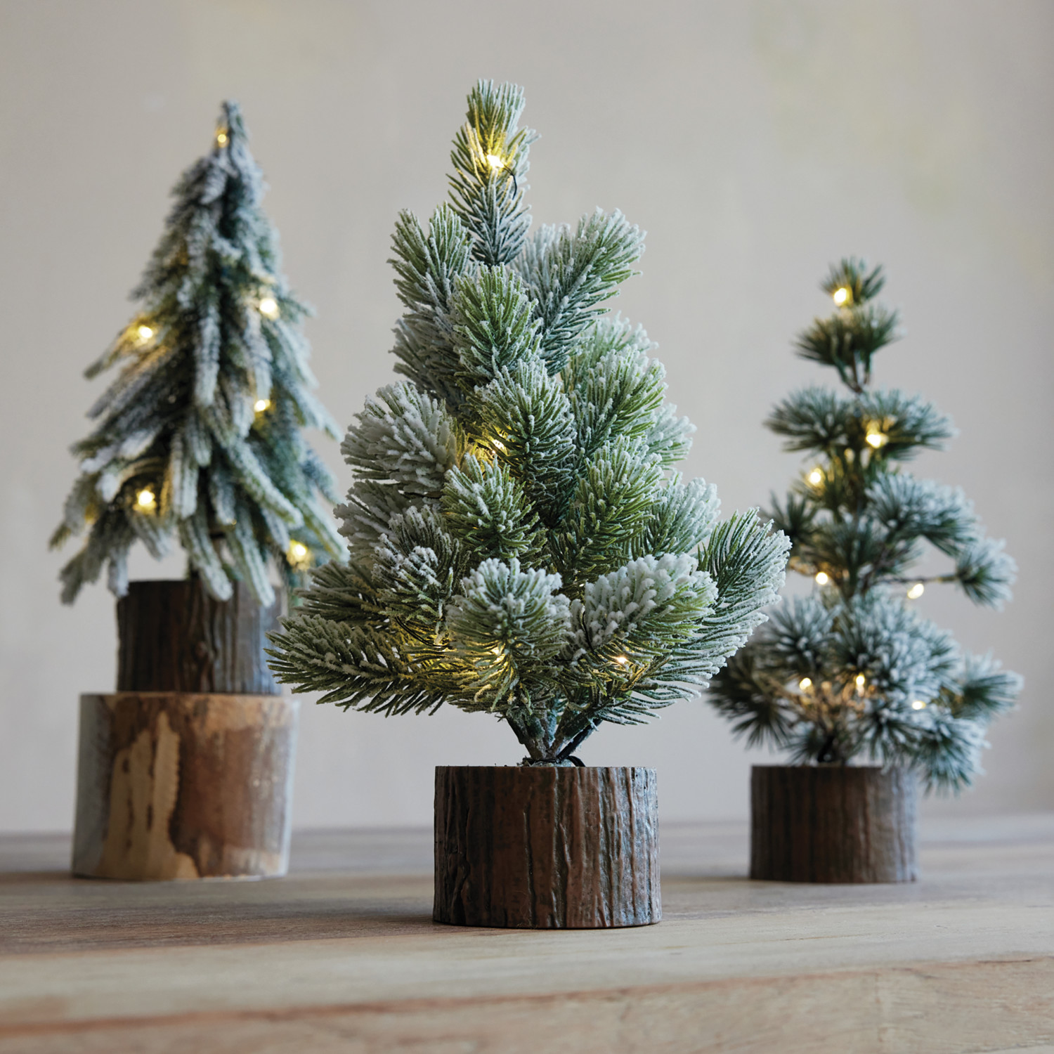 Plastic Tree with Faux Wood Slice Base & LED Light, Snow Finish, 3 Styles