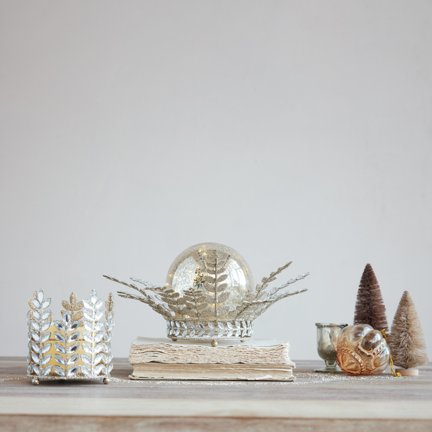 Metal Votive Holder with Acrylic Jewels, Glitter & LED Candle, Set of 2