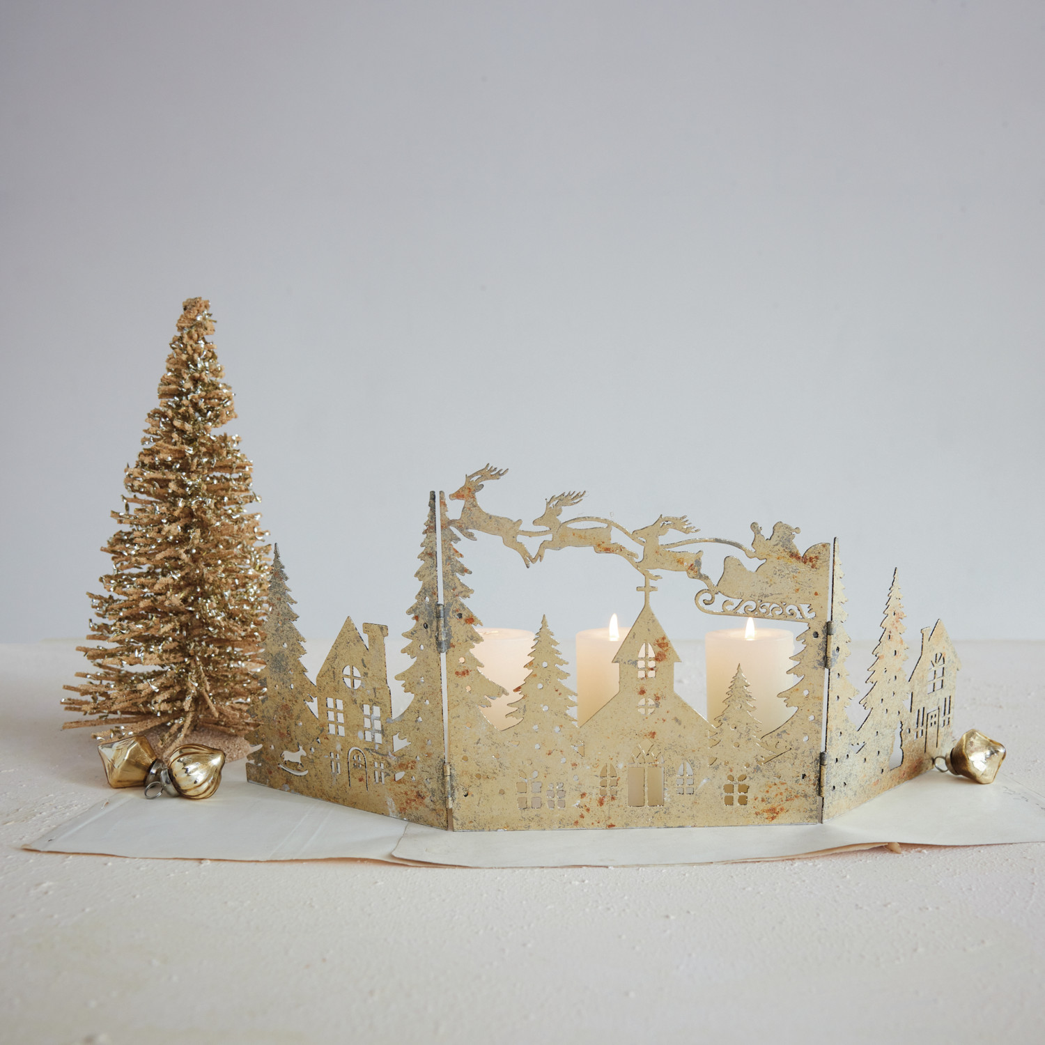 Metal Folding Mantle Scene with Santa, Sleigh & Village, Distressed Gold Finish