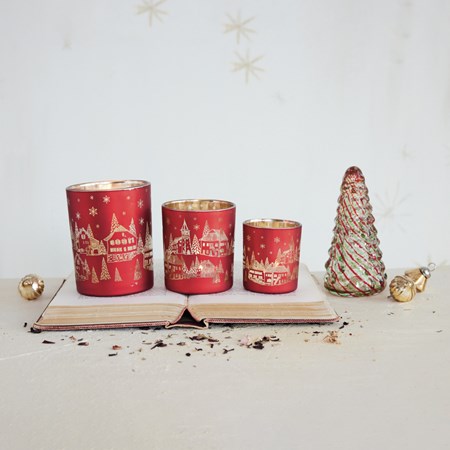 Catalog Name: 20"W x 8"H Metal Folding Mantle Scene w/ Santa, Sleigh & Village, Distressed Gold Finish