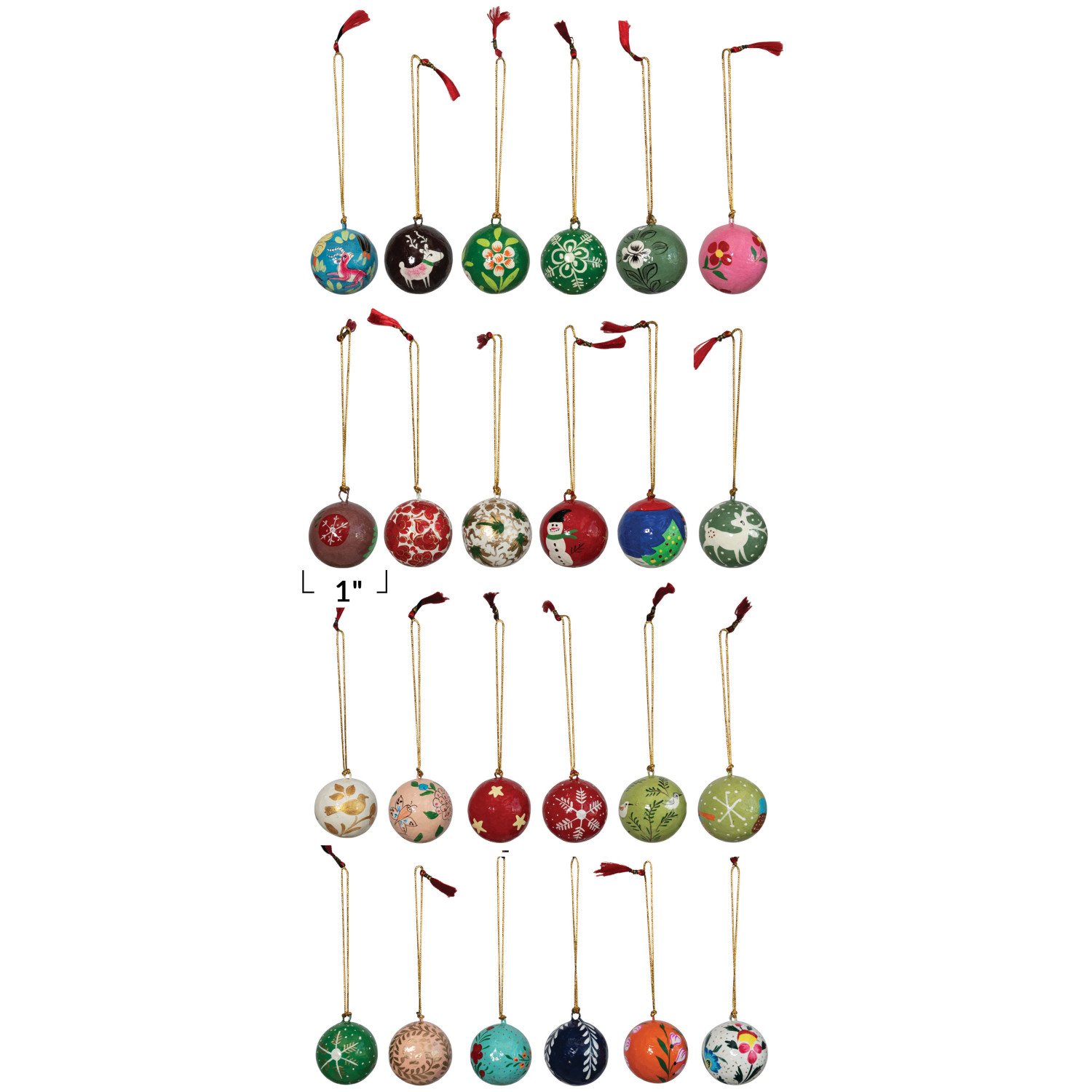 Catalog Name: 1" Round Hand-Painted Paper Mache Ball Ornaments w/ Tassel in Egg Crate, Multi Color, Set of 24