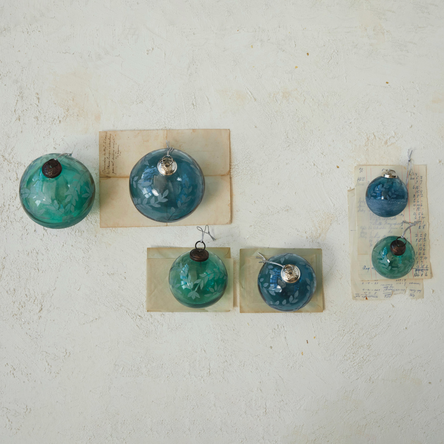 Recycled Glass Ball Ornament w/ Etched Leaves, 2 Styles