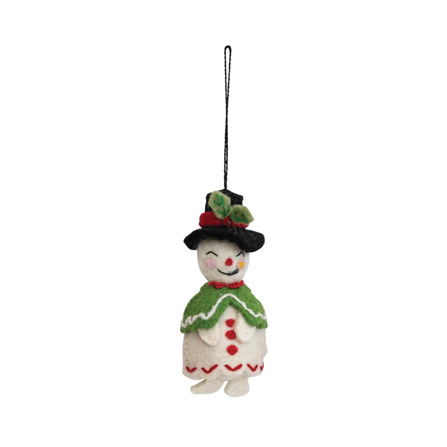 This whimsical wool felt Snowman ornament showcases delicately pieced features finished with intricate hand-embroidery. Ornaments can be showcased as decorations on a Christmas tree, wreath, or atop a festive centerpiece, hung from doorways, displayed on mantels, used to embellish cards and presents, or given as gifts.