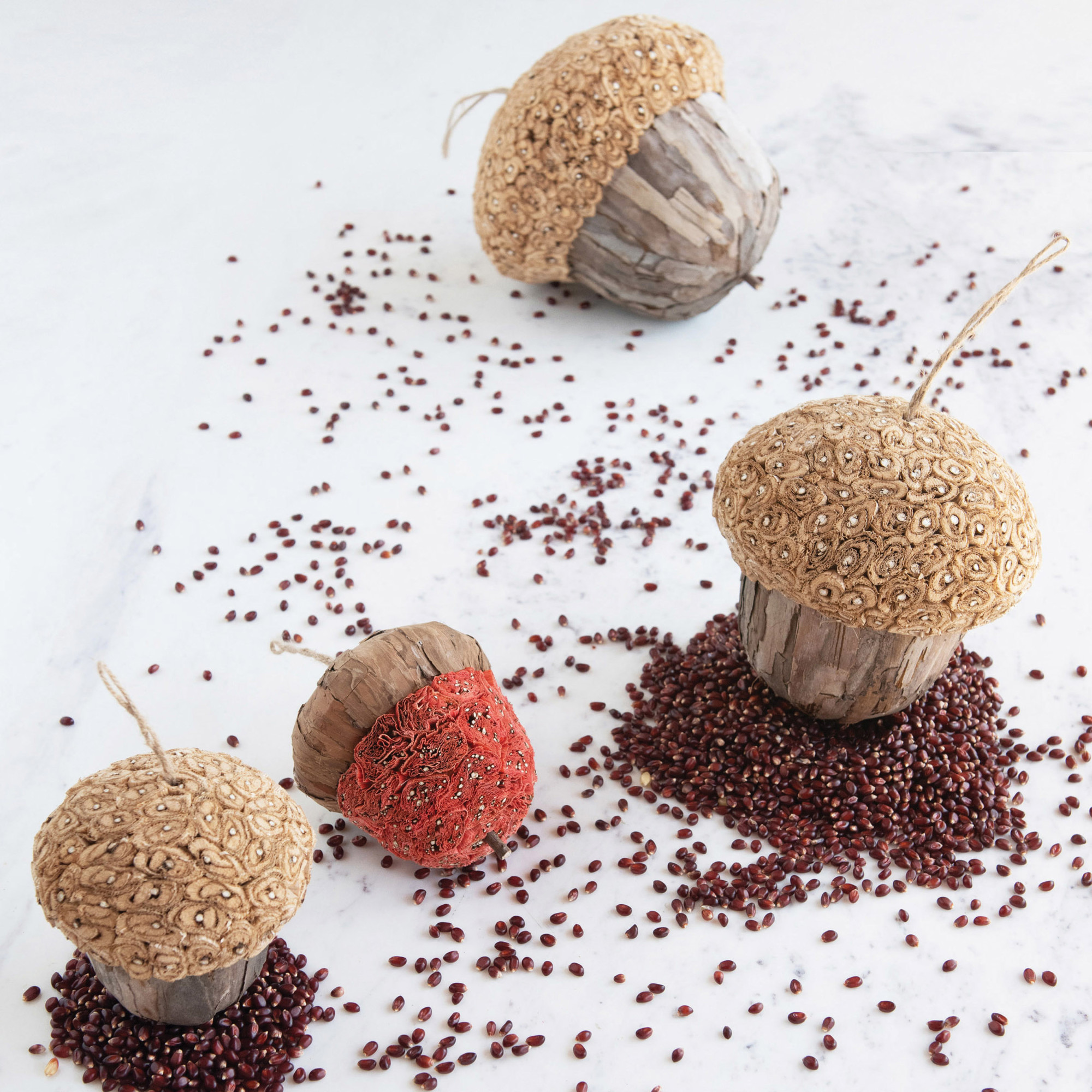 This acorn ornament can be used for a stylish fall tablescape, or for a nature-inspired Christmas tree. Made out of jujube bark, this acorn ornament features an orange shade that matches perfectly with the fall style. Can be used as a fall or Christmas decoration, and adds a pop of nature to any home.
