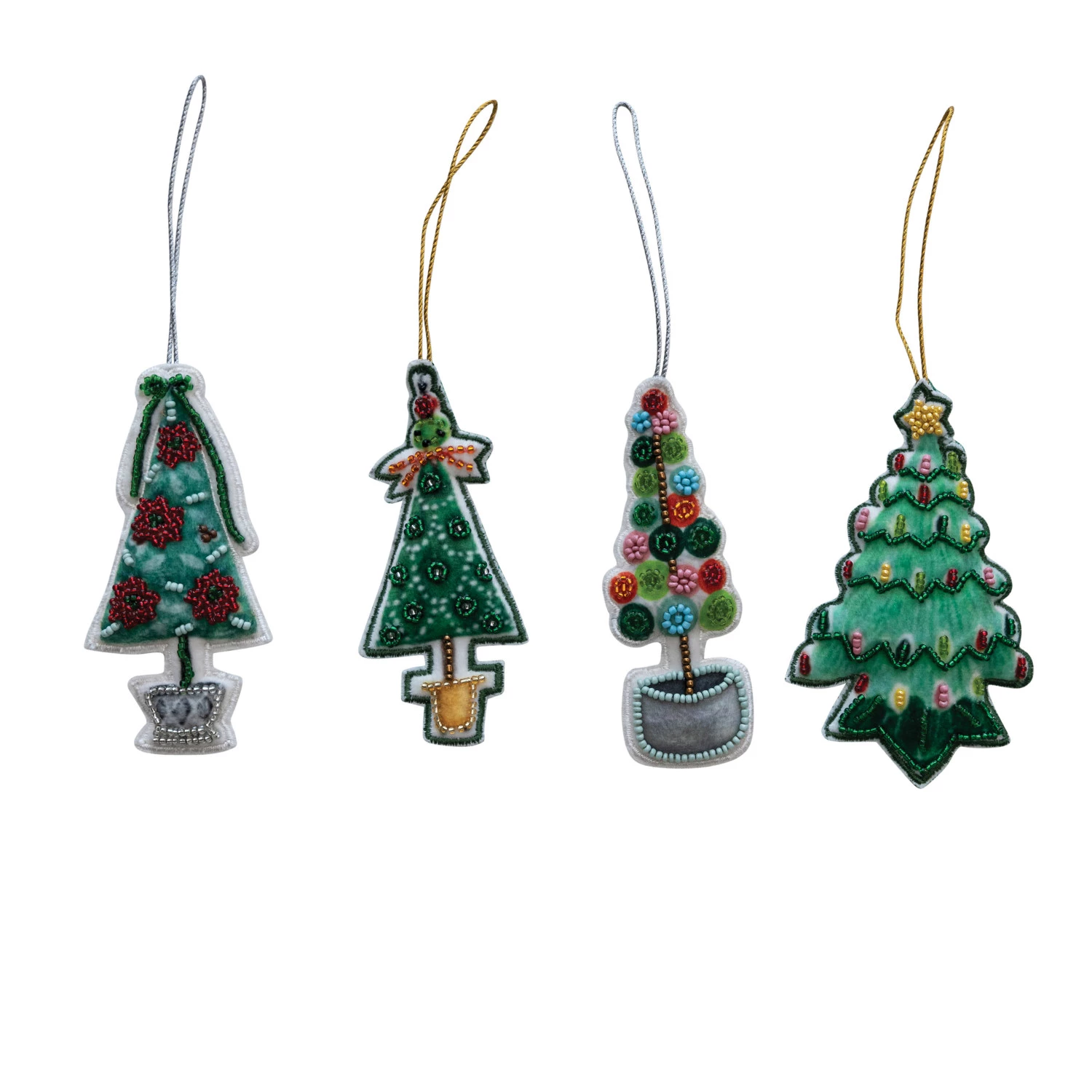 4-1/2"H Beaded Cotton Velvet Tree Ornament, Multi Color, 4 Styles