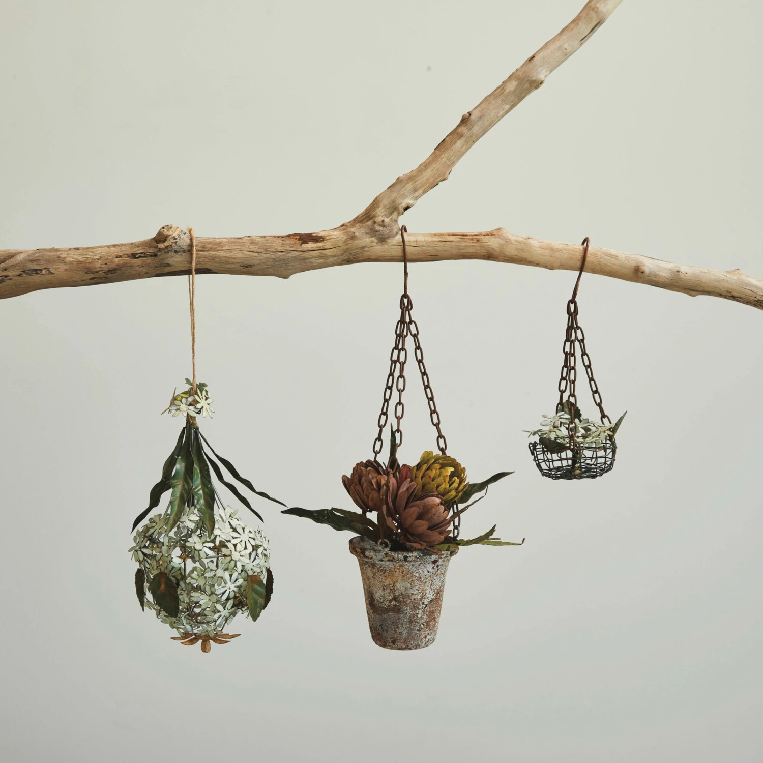 Metal Flowers in Basket Ornament, Distressed Finish, Multi Color