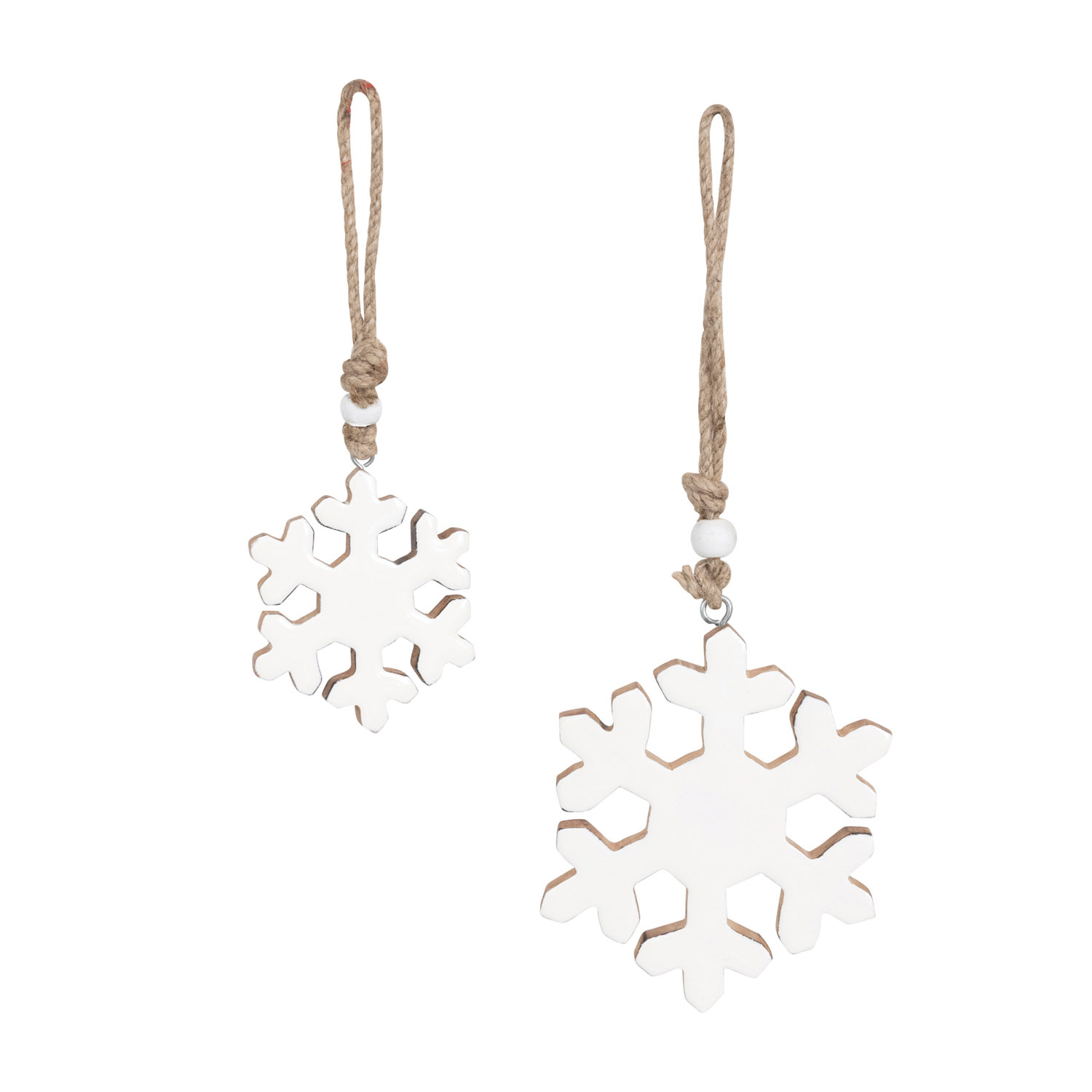 Catalog Name: 4-3/4"H & 5-1/2"H Enameled Mango Wood Snowflake Ornaments w/ Wood Beads, White & Natural, Set of 2