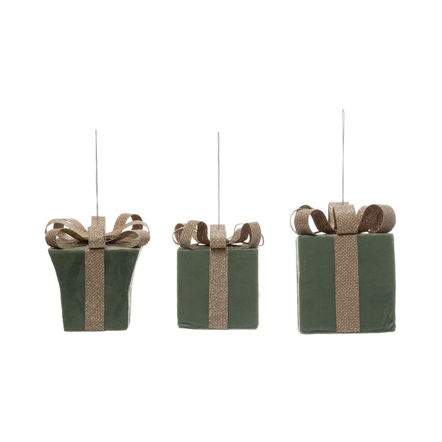 Catalog Name: 3"H Velvet Gift Box Ornament w/ Glitter Bow, 3 Styles