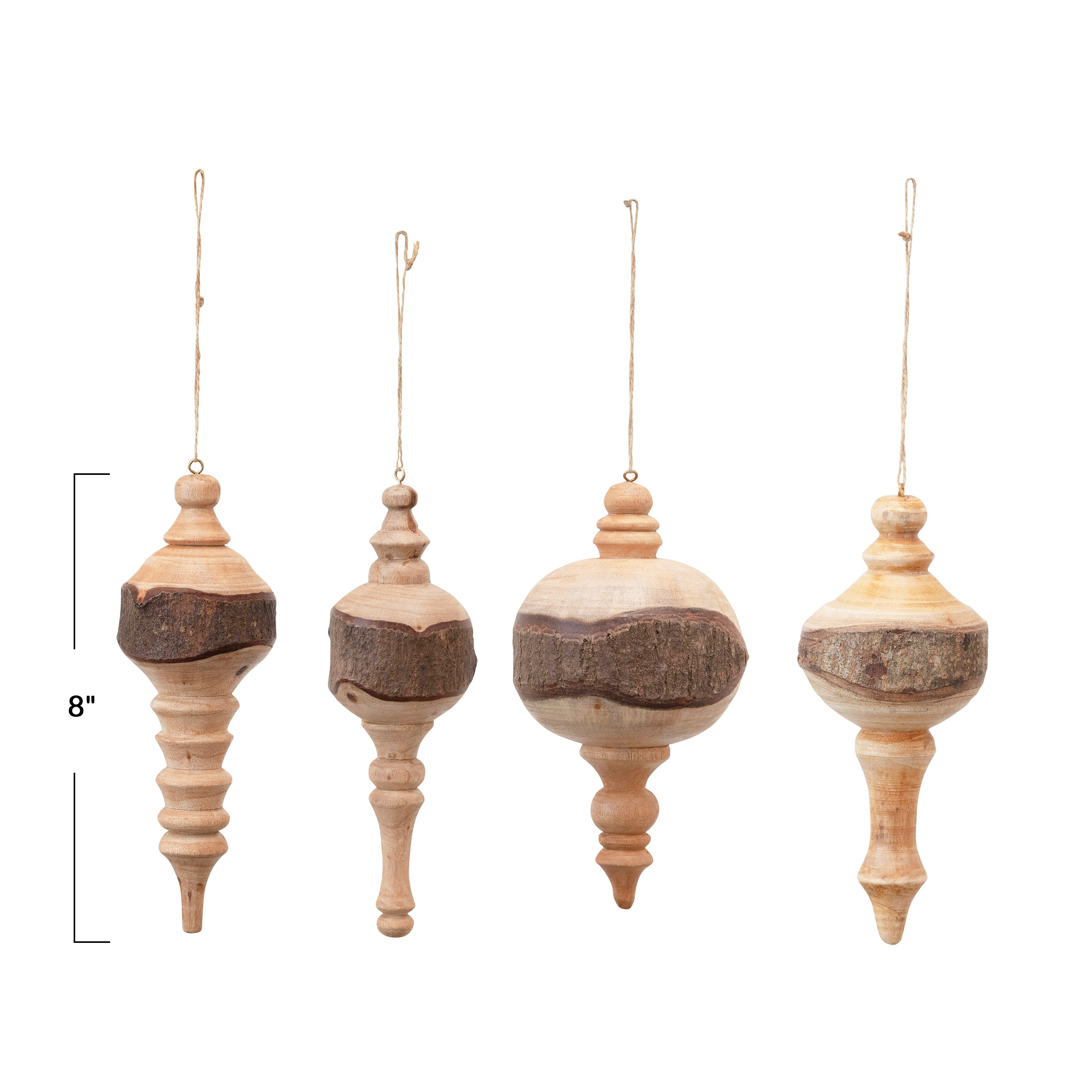 These ornaments are a beautiful addition to any Christmas tree. Made out of carved mahogany wood, these finial ornaments add both sophistication and a pop of nature. These come in 4 styles, and each one will vary slightly.