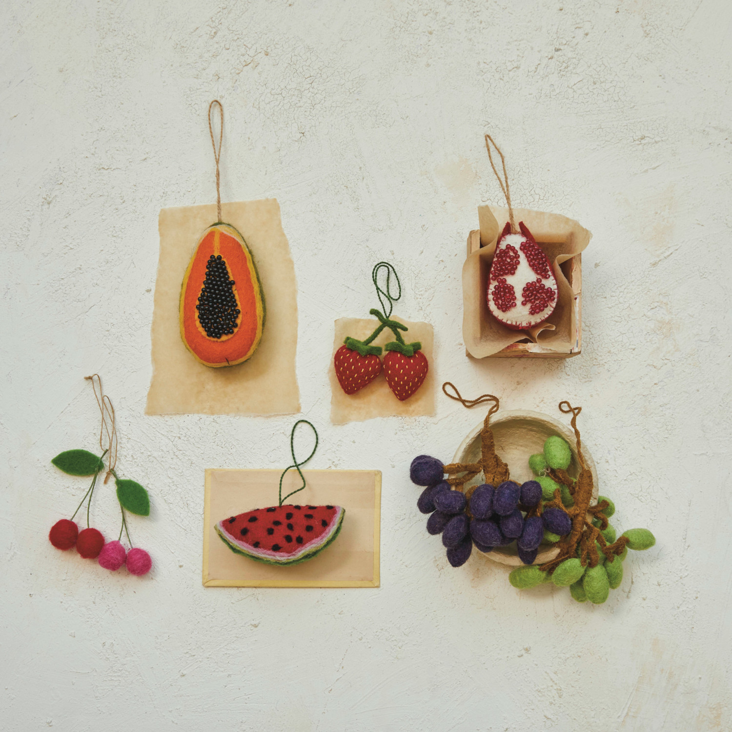 This handcrafted wool felt pomegranate ornament, embellished with beads and embroidery, is a celebration of skilled artisanship. The red and cream colors are a nod to the fruit's natural beauty, while the added texture from the beads and embroidery creates a luxurious feel. Measuring 2.5 inches long, 2.0 inches wide, and 3.5 inches high, it's the perfect size to stand out on a festive tree or to add a sophisticated touch to any room. The combination of wool blend and jute ensures that this ornament will be a cherished part of every decor for many seasons to come. A festive symbol of abundance, this handcrafted ornament dazzles with intricate beads and embroidery on a lush red and cream wool felt pomegranate. An elegant showpiece, it infuses any decor with a sense of luxury and traditional charm. Ideal for seasonal celebrations or as a year-round decorative item, it brings a touch of artisanal beauty to the space.