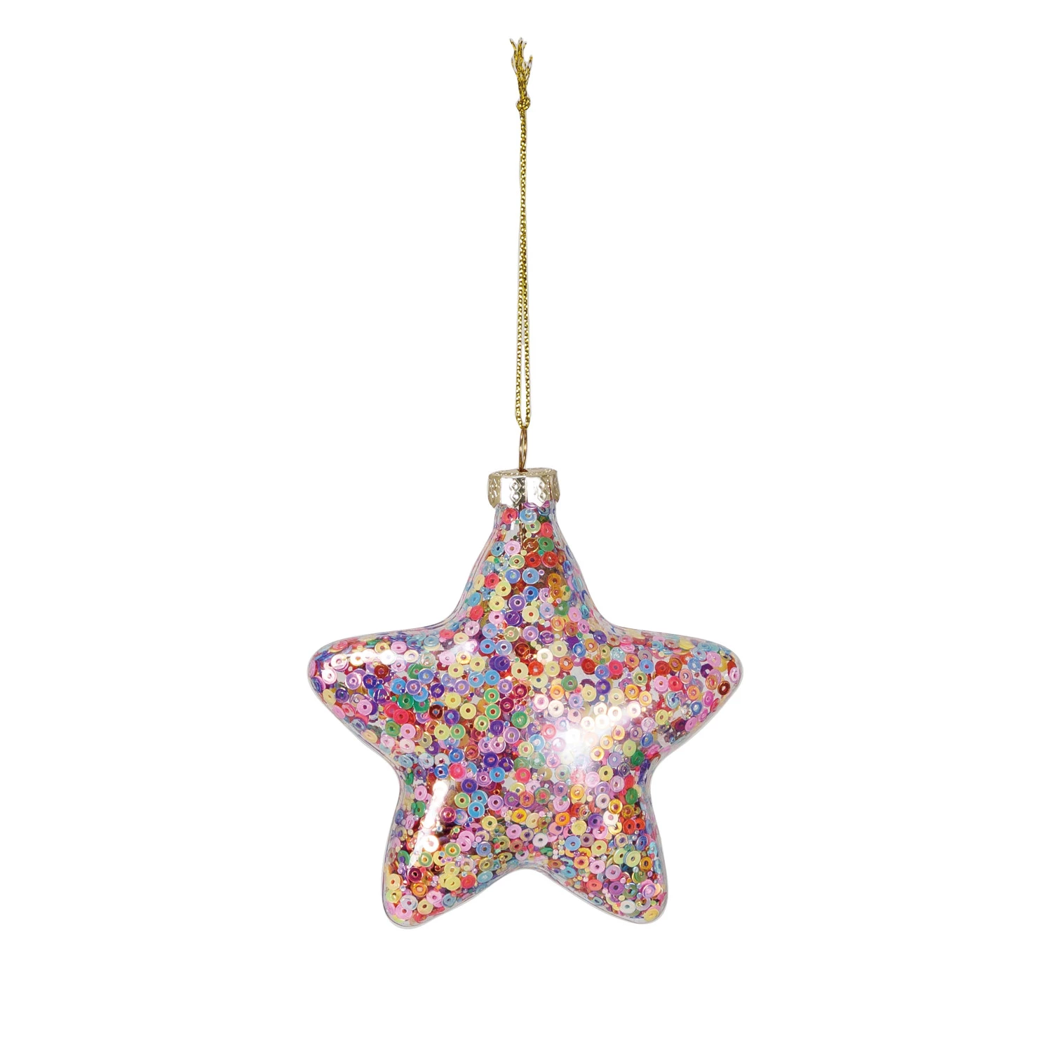 This glass star ornament is a treasure trove of shimmer. Its body, a clear glass canvas, is filled to the brim with sequins that reflect a spectrum of festive hues. It's not just an ornament; it's a beacon of holiday spirit, ready to bring a twinkle to the eye and a glow to the heart of any celebrant. The ornament is 3.25 inches in length and height, ensuring a dazzling display among the holiday decorations. This is a perfect choice for anyone who loves whimsical and adorable holiday decor. A glass star ornament filled with sequins, casting a vibrant dance of multicolor light. An ornament that adds a burst of color and sparkle, perfect for a lively and festive atmosphere. Ideal for prominent display, where it can catch the light and complement the festive cheer.