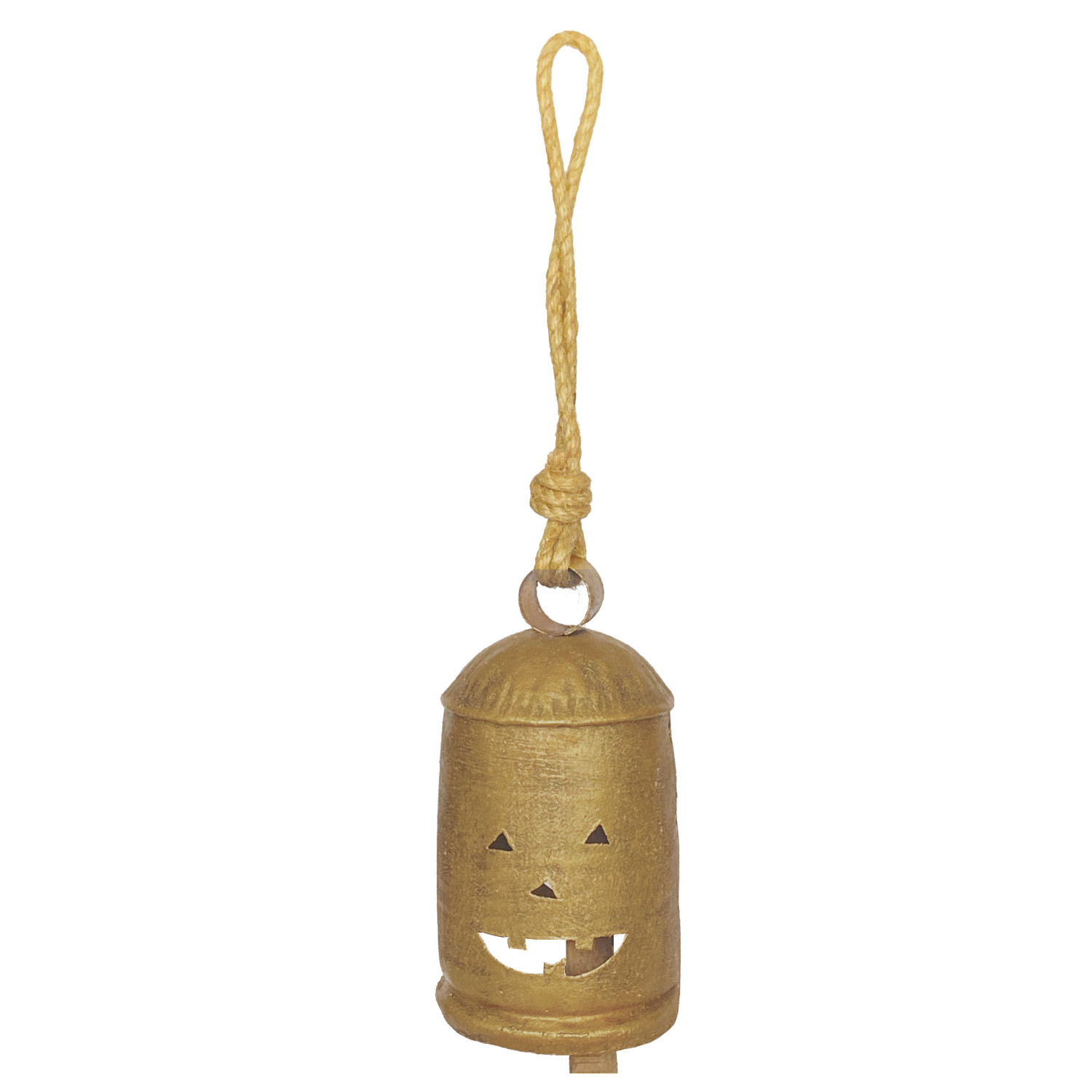 Catalog Name: 4" Round x 7-1/4"H Metal Bell w/ Jack-O-Lantern Cut-Outs & Jute Hanger, Antique Gold Finish