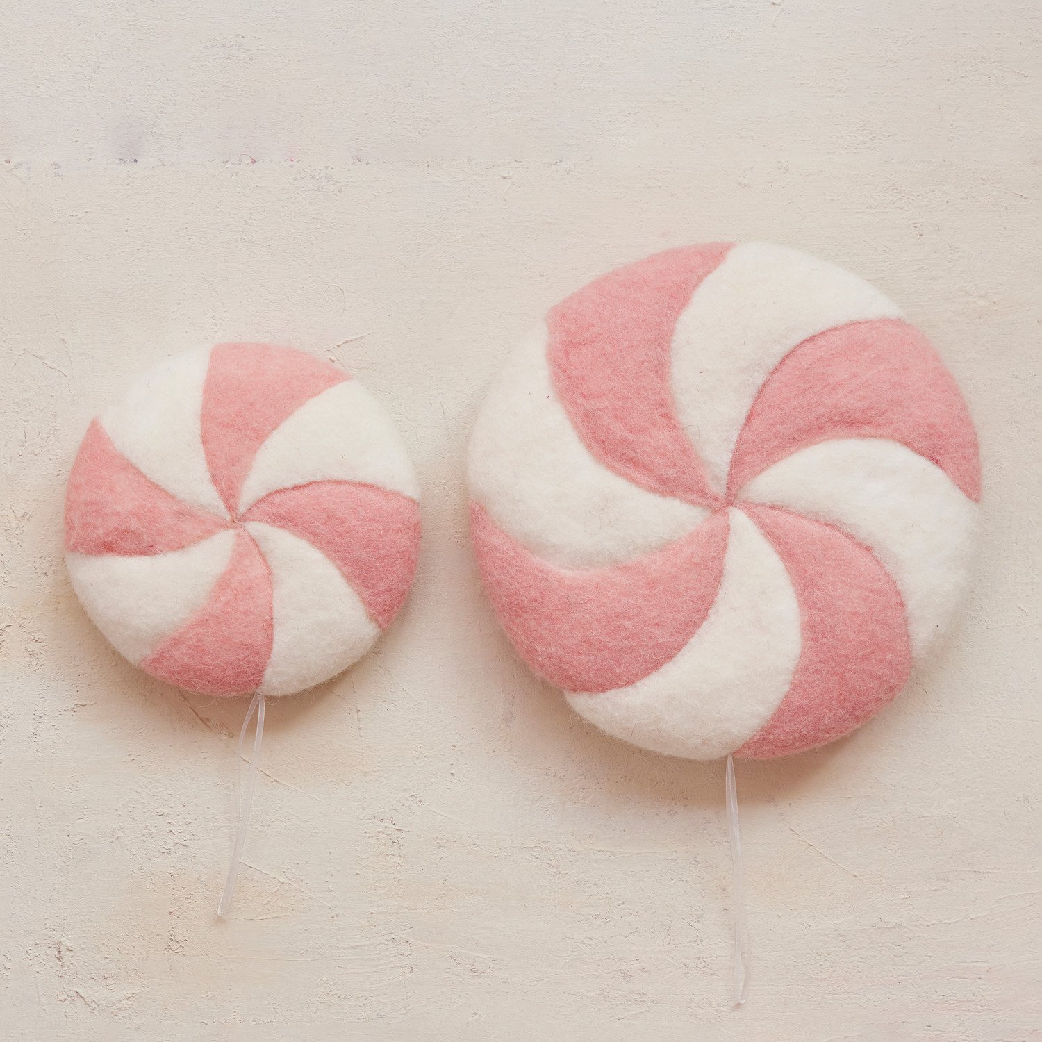 10-1/4" Round Handmade Wool Felt Candy Ornament, Pink & White
