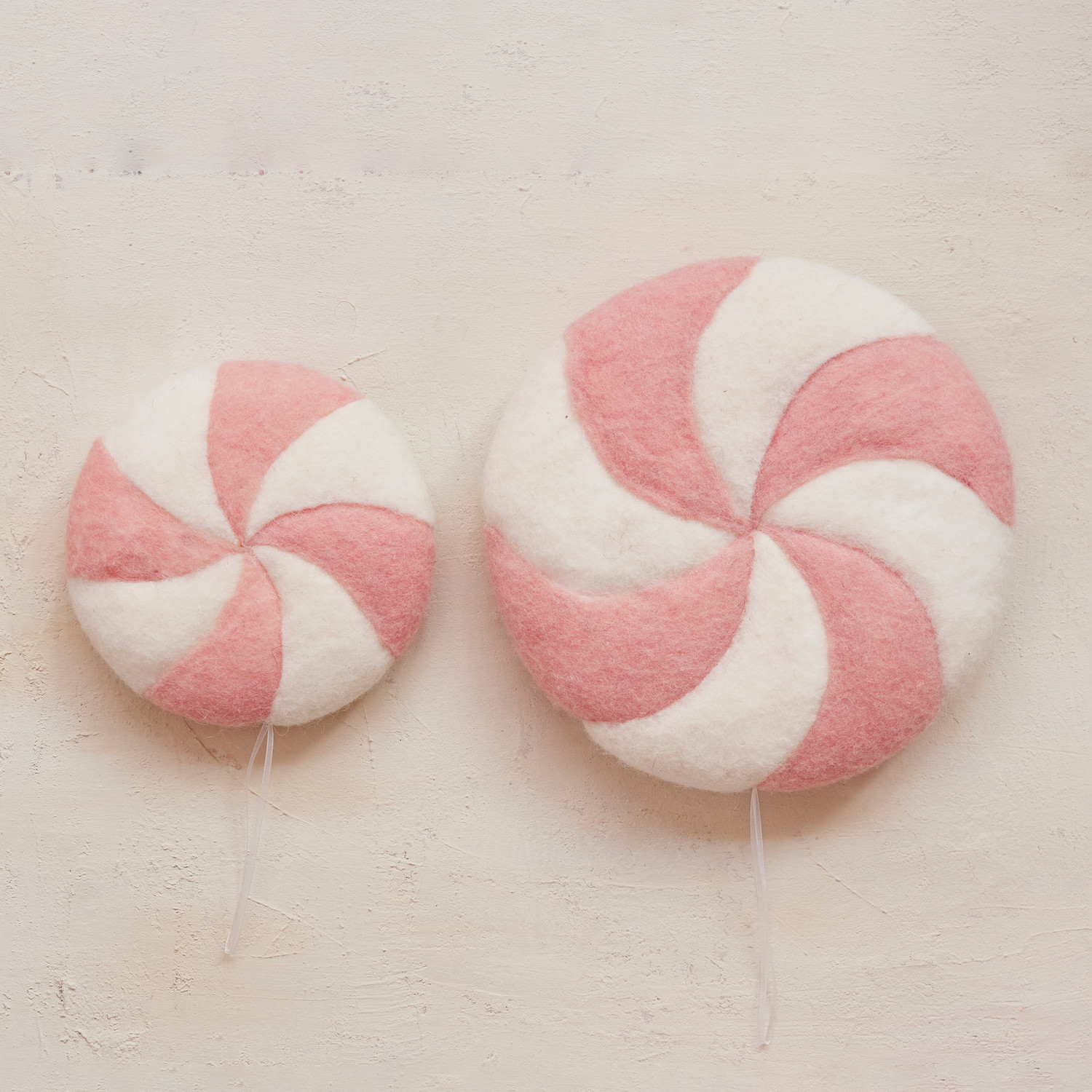 7-1/2" Round Handmade Wool Felt Candy Ornament, Pink & White