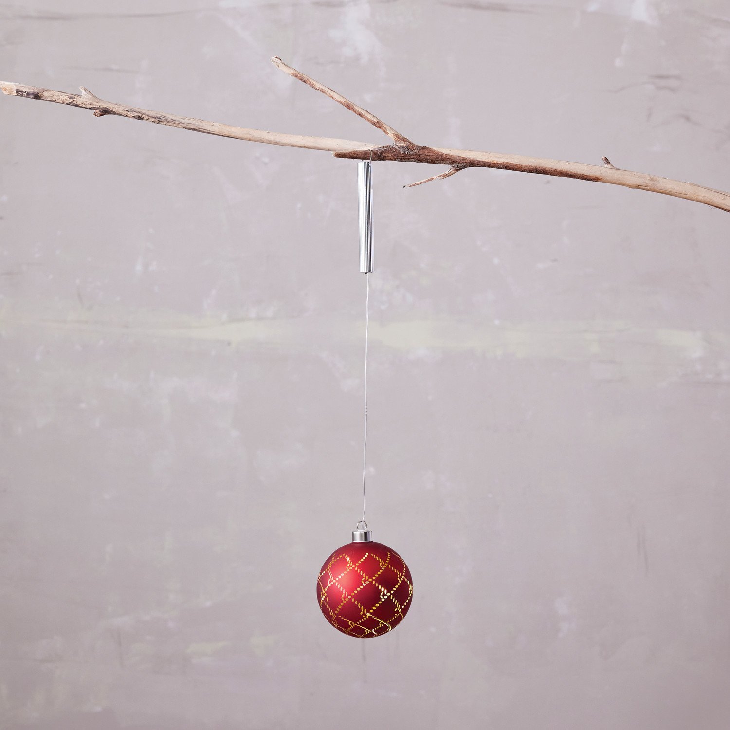 Catalog Name: 4-1/2" Round Glass Ball Ornament w/ LED Light & Laser Etched Pattern, Matte Red, Gold & Silver Finish (Requires 2-AAA Batteries)