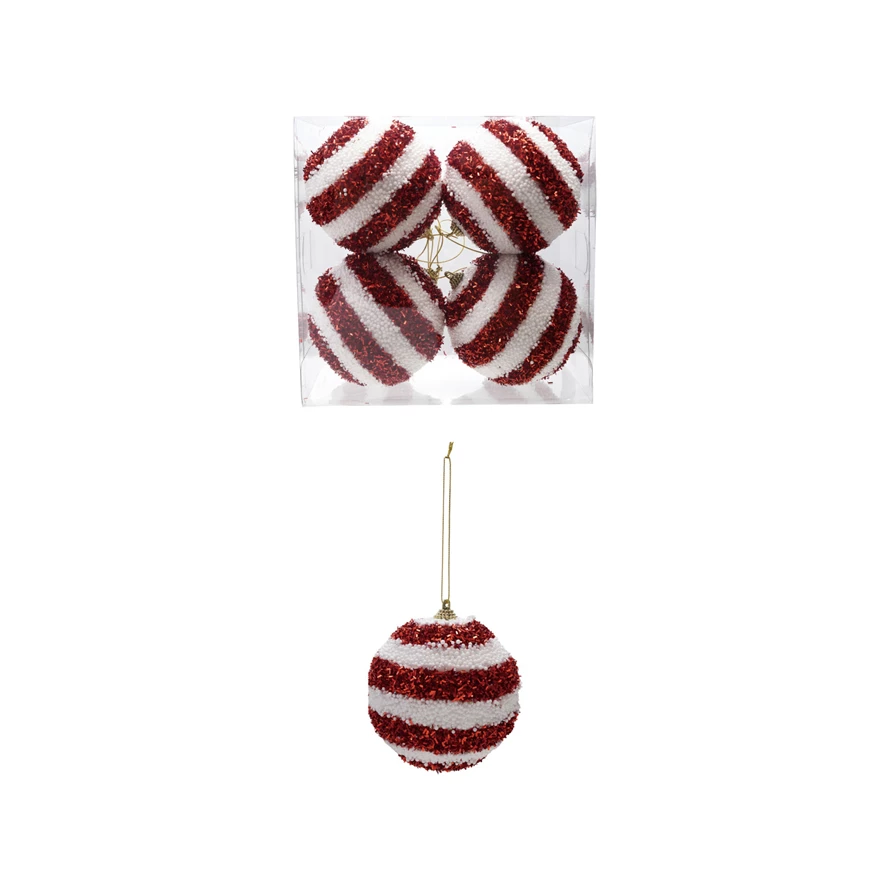 Catalog Name: 4" Round Foam Ball Striped Ornaments w/ Beads & Tinsel, Red & White, Boxed Set of 4