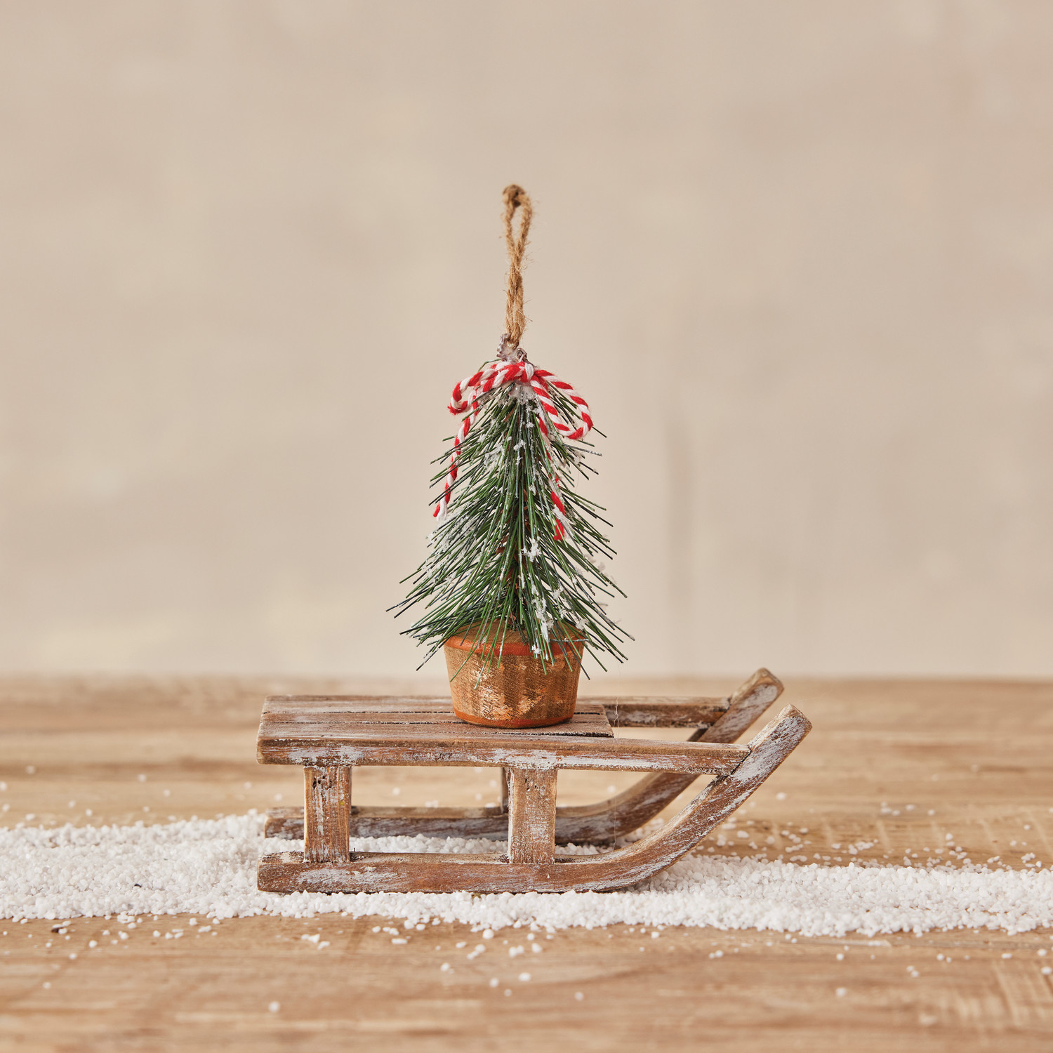5-3/4"L x 6"H Wood Sled Ornament with Plastic Tree & Striped Bow